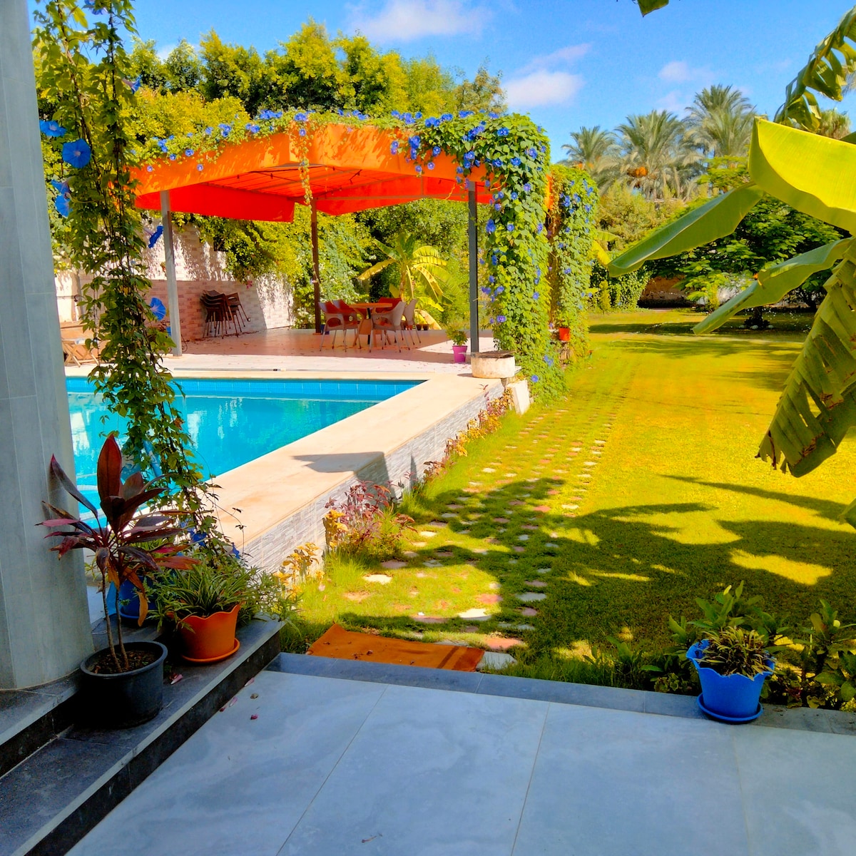 Private place suitable for familes and hijabi women who seek FULL privacy with two large pools.2.5 m depth the first one the other is suitable and safe for kids. Specious large garden with a high heavy Privacy trees , which add full privacy to the pools and garden. Indoor covered parking keeps my guest's cars safe and away from the sun. Amazing cleaning standard to hole property inside and outside.pools and garden are maintained in regular basis during guests stay .