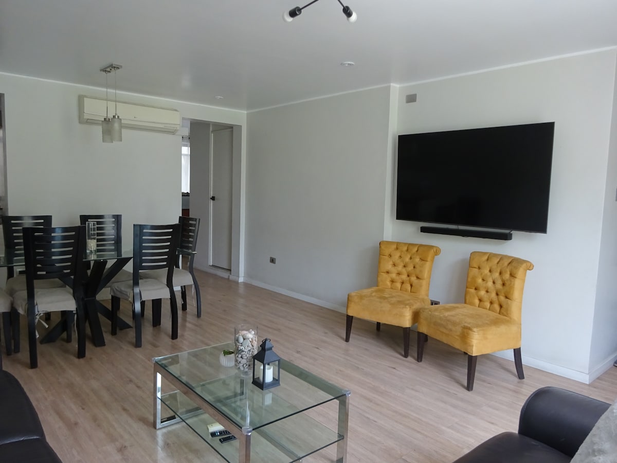 Moderan i udoban stan na prvom spratu, idealan za porodice, studente ili putnike. Ima 3 namještene spavaće sobe, brzi Wi-Fi, Smart TV sa strimovanjem i kapacitet za 5 osoba. Nalazi se u bezbjednom području Santa Anita, u blizini USMP-a, Agrarije, USIL-a, Mall Aventura i linije 2 voza. Savršeno za kraći ili srednji boravak. Osjećajte se kao kod kuće od prvog dana!