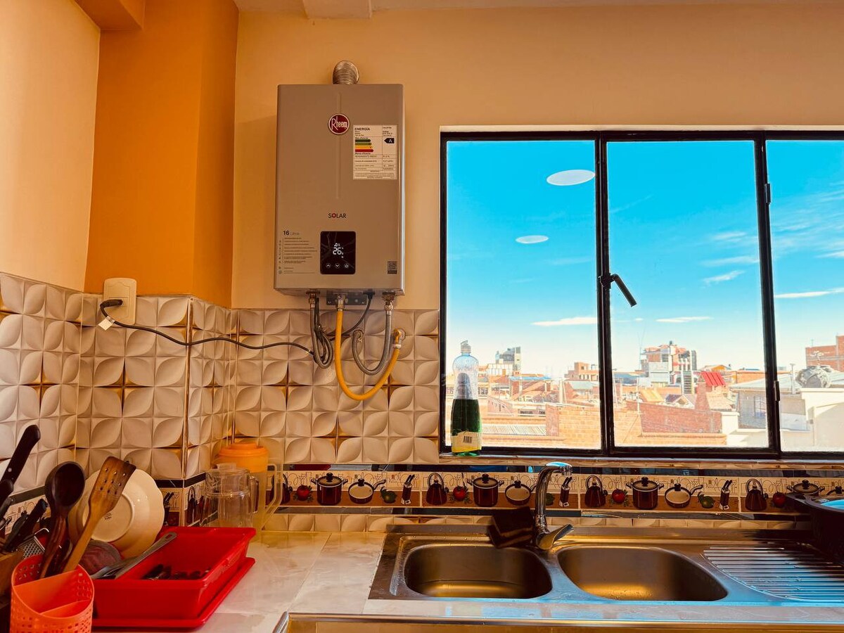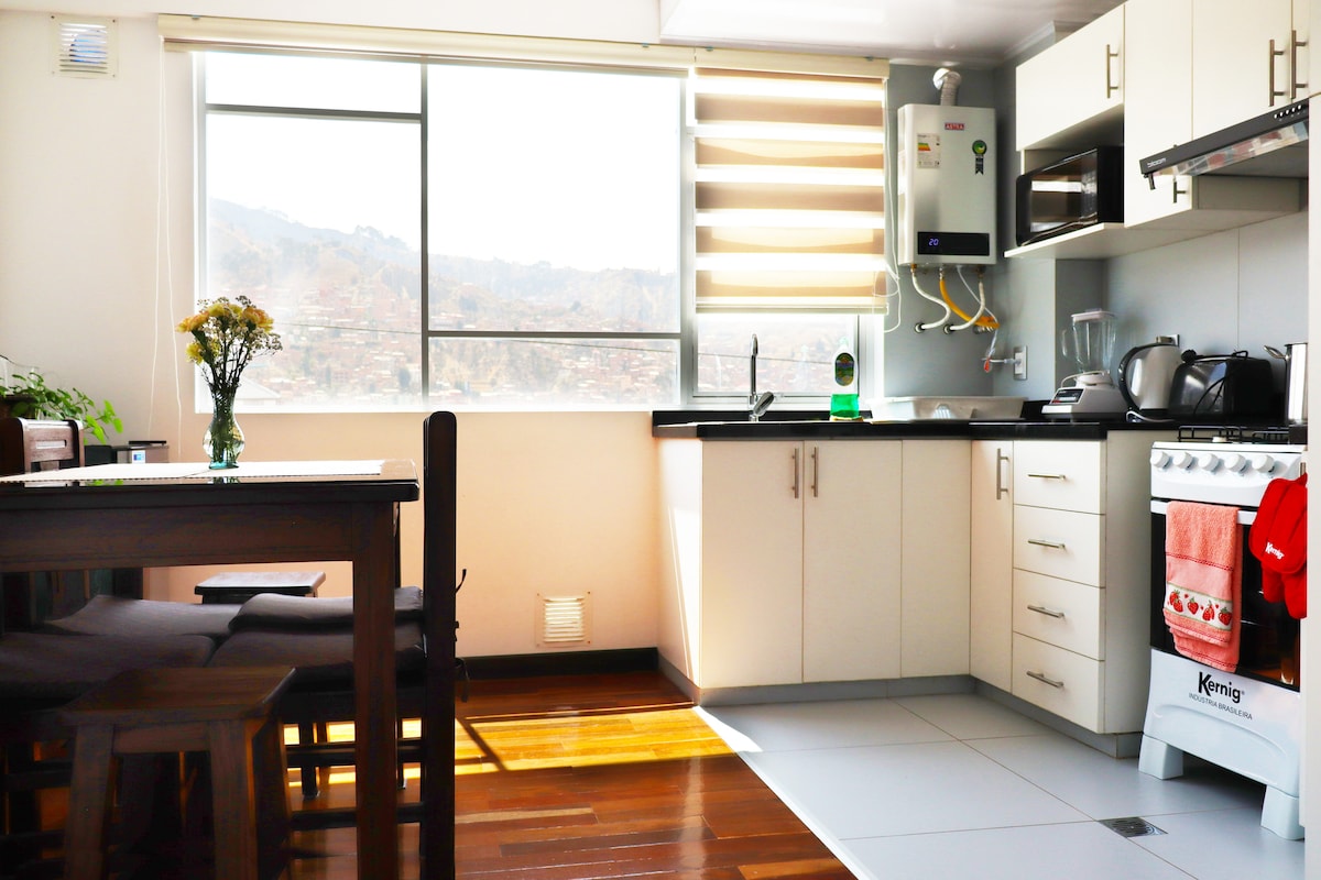 Opustite se u mirnom i povoljno smještenom stanu. Nekoliko minuta od aerodroma, 4 bloka od žičare i u blizini sajma 16 de Hulio, gdje možete da doživite lokalnu kulturu među ukusima, bojama, tipičnom odjećom i jedinstvenim rukotvorinama. ---------------------------------------------- Opustite se u mirnom, dobro smještenom stanu. Nekoliko minuta od aerodroma, 4 bloka od žičare i u blizini sajma 16 de Julio - gdje lokalna kultura obiluje hranom, bojama, rukotvorinama i tradicionalnom bolivijskom odjećom.