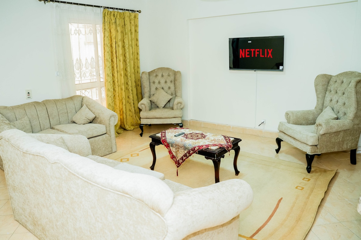 Dobro došli u naš Maadi dragulj s 3 kreveta i 3 kupatila, površine 220 m2! Uživajte u otvorenom pogledu, potpuno opremljenoj kuhinji, pametnom TV-u od 55inča i munjevitom brzom Wi-Fi mreži. Praktično smješteni u blizini prodavnica i restorana, Carrefour i 50 Hub Mall su udaljeni samo 2 minuta. Istražite Maadijev šarm i atrakcije Kaira iz ovog elegantnog i centralnog utočišta. Savršeno za porodice ili grupe koje istražuju živopisnu scenu Kaira. Nije dozvoljeno da muškarci budu sami gosti. Samo za dame, parove i porodice.