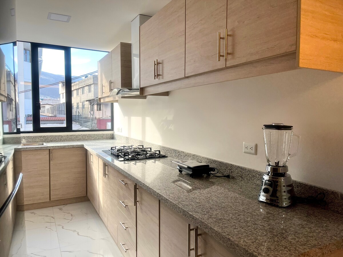 Boravite u elegantnom apartmanu i uživajte u najboljem pogledu na Kito, u jednoj od najviših zgrada u glavnom gradu Blizu Olimpijskog stadiona Atahualpa, tržni centri Krevet 3 kvadrata, kauč na razvlačenje, TV, Wi-Fi, Netflix, opremljena kuhinja 1 1/2 kupatilo Mašina za pranje veša, mašina za sušenje veša, pegla za veš Pristup teretani, terasi, dečjem igralištu Mokri prostori, prostor za roštilj (u zavisnosti od dostupnosti i rezervacije 48 sati unaprijed) Kad vaša rezervacija bude potvrđena, od vas će se tražiti da dostavite zvanični identifikacioni dokument.