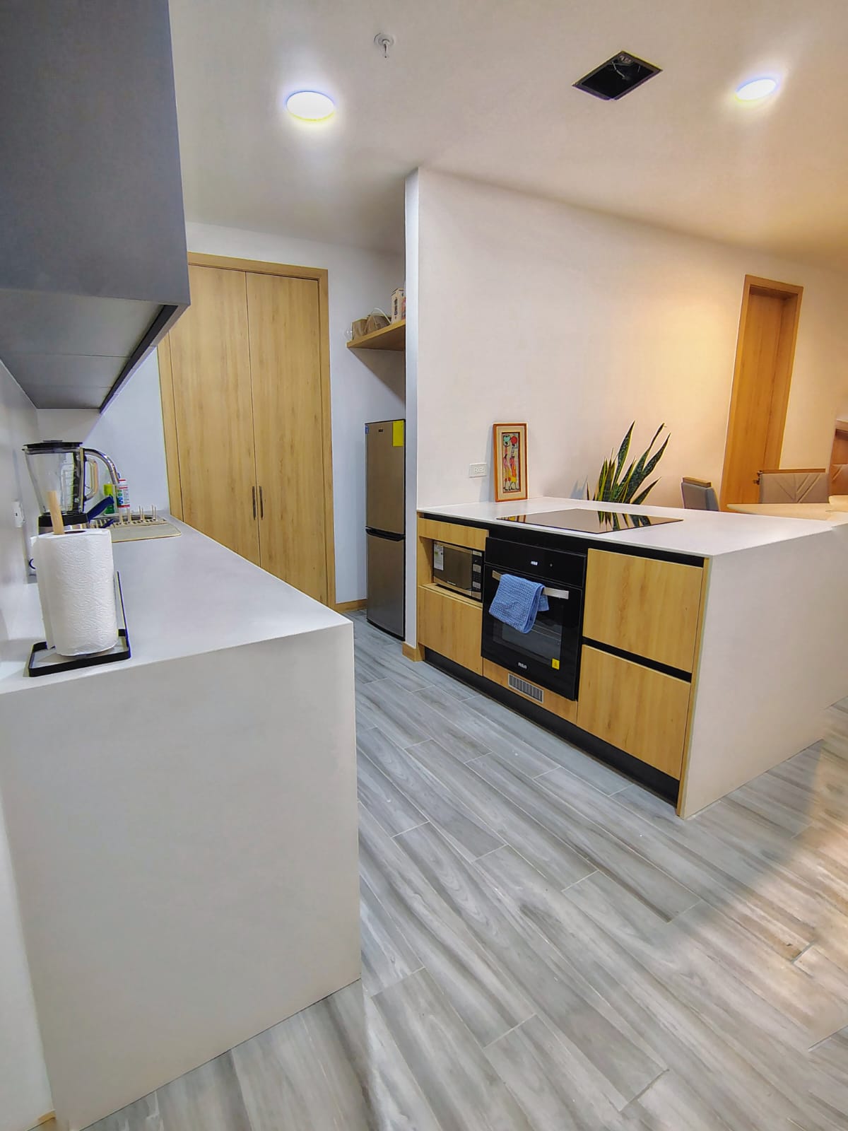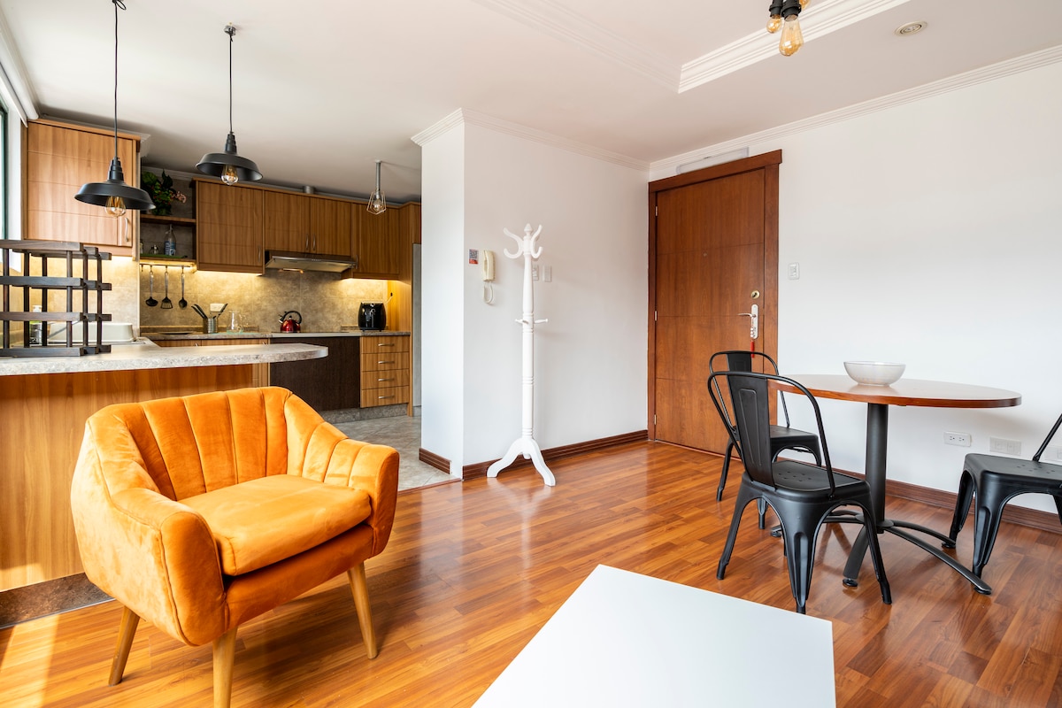 Ugaoni apartman sa prozorima od poda do plafona i balkonom, sa panoramskim pogledom na vulkan Pičinča i grad. Nalazi se u području Plaza Artigas (Av. 12 de Octubre), 3 minuta hoda od Swissotela. Uključuje parking (1 vozilo) i prijavu u smještaj 24/7 uz pomoć portira. Stabilan Wi-Fi i trpezarijski sto pogodan za rad. Supermaxi, Fybeca i La Carolina Park udaljeni su oko 15 minuta taksijem/automobilom.