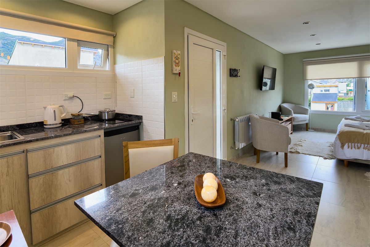 El departamento ubicado a pasos de la Av. principal y de las sendas de este encantador pueblo; cuenta dos ambientes; una luminosa sala de estar y comedor integrados a una cocina completamente equipada con cocina vitroceramica, microondas, heladera, tostadora, pava eléctrica, utensilios y hermosa vajilla. Dispone de una elegante barra central de madera, sillones y una recepción. Y ofrece una habitación independiente con opción de una cama doble o dos camas individuales con smart TV! Inolvidable!
