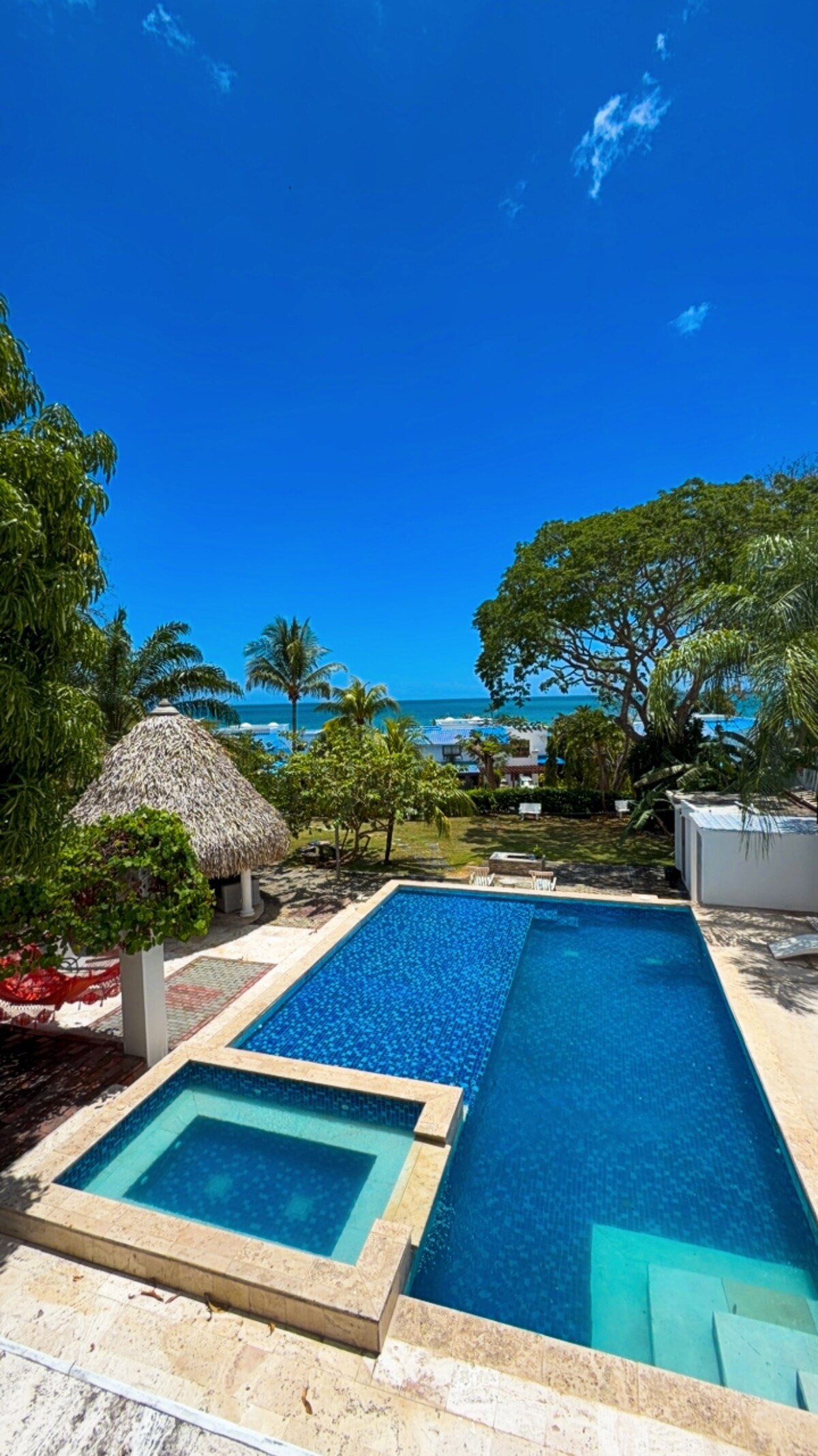 Opustite se u ovoj prostranoj vili uz plažu s privatnim bazenom, terasom na krovu i stazom s palmama koja vodi pravo do plaže. Savršeno za porodice, grupe ili posebne događaje — bilo da dijelite večeri sa roštiljem, posmatrate zalaske sunca na krovu ili jednostavno uživate u tropskoj atmosferi. Samo 2 sata od Panama Sitija i odmah ispred plaže! • Vila uz plažu sa direktnim pristupom • Privatni bazen + Palm Garden • Krovna terasa s pogledom na zalazak sunca od 360° • Brzi Wi-Fi i namjenski radni prostor