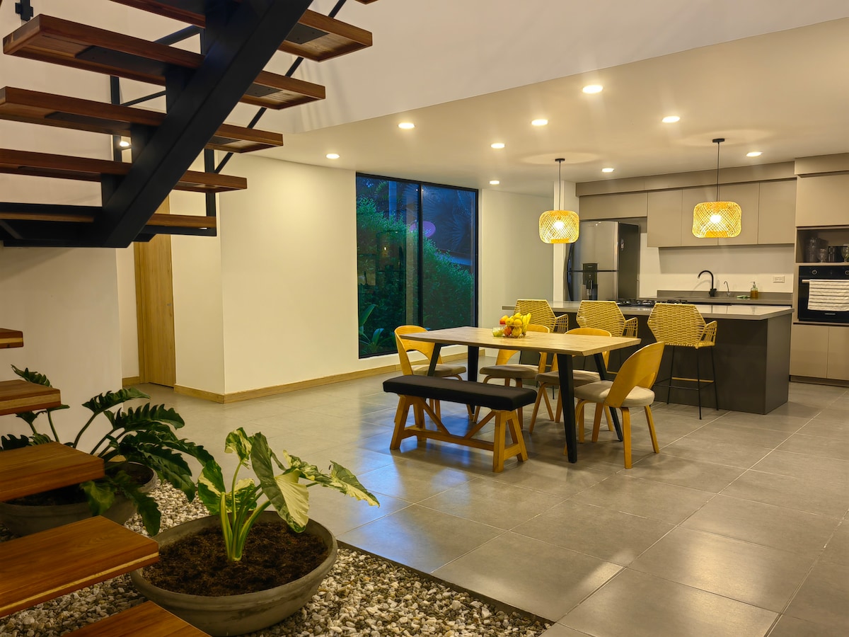 Dobro došli u naše utočište u Quindío-u! Otkrijte spokoj u 4 udobne sobe sa 9 kreveta. Opustite se u bašti i bazenu. Pripremite poslastice u opremljenoj kuhinji ili uživajte u prostoru za roštilj. Sa 4 kupatila, garantujemo udobnost. Pet minuta od Café Parka i 20 minuta od Panaca, blizu smo svih turističkih atrakcija Odjela za kafu. Savršen odmor u prirodi i zabavu! Čekamo vas