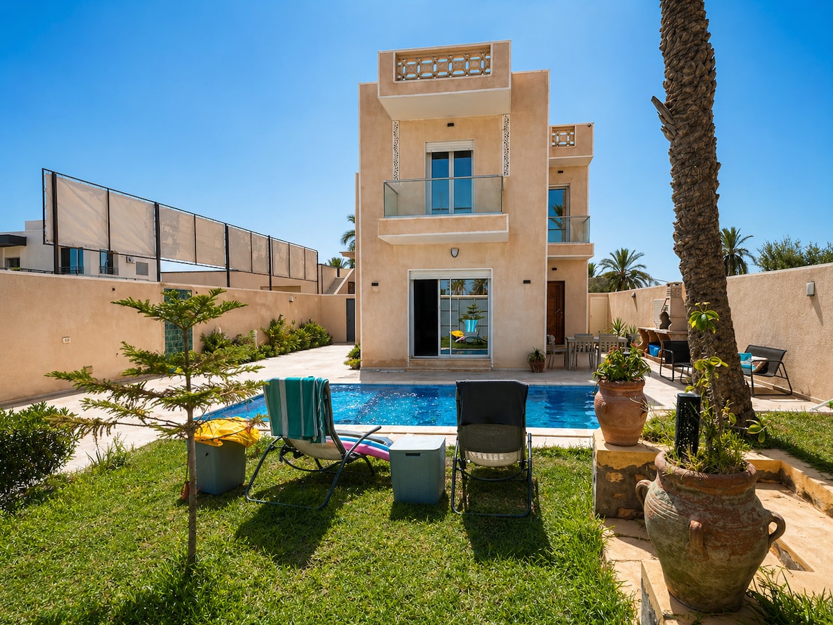 Dobro došli u svoje mirno utočište u Đerbi! Ova prostrana i svijetla vila može da primi do 8 osoba, idealna za odmor za porodice ili grupe prijatelja. Uživajte u mirnom okruženju, pogledima bez prepreka i privatnoj bašti s bazenom samo za vas. Unutrašnjost je u potpunosti klimatizovana i opremljena: • Moderna kuhinja sa svim potrepštinama • Wi-Fi da biste ostali povezani • Klima-uređaj u svim sobama • Besplatan privatni parking