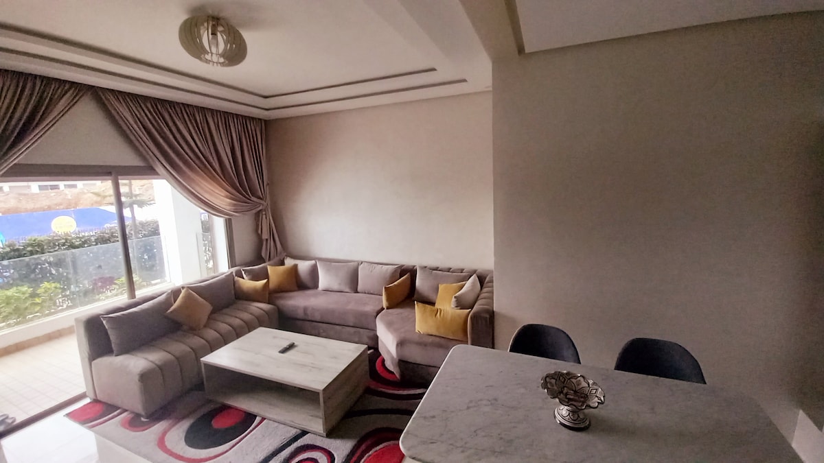 Dobro došli u naš elegantni stan u Parc de Mohammedia, savršen za odmor ili posao. Uživajte u udobnosti i miru u blizini plaže i sadržaja. Prostrane spavaće sobe sa balkonima, svijetla dnevna soba sa stonim fudbalom, potpuno opremljena kuhinja i dva moderna kupatila. Besplatan Wi-Fi, klima-uređaj, bezbjedan parking i mašina za pranje veša su uključeni. Aktivnosti u blizini: šetnja, vodeni sportovi, kulturne posjete i restorani. Rezervišite sada za nezaboravan boravak u Mohammediji.
