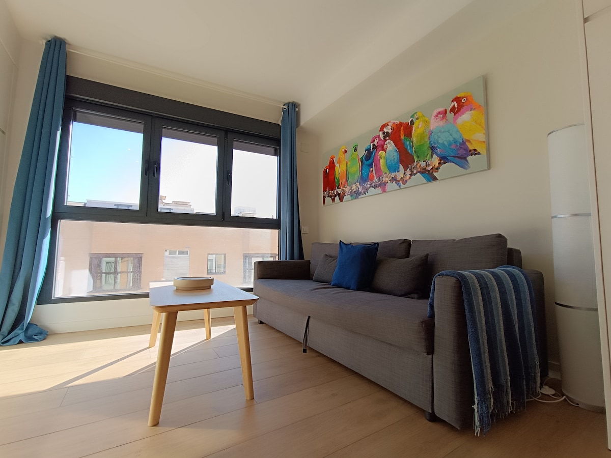This cozy and bright apartment is totally exterior and is in a recently constructed building, so everything you see is new. It is located in a very lively area that has outstanding connections: underground station by the door and close to Plaza Castilla. Ideal if you are coming by car, as it is outside the traffic restricted area. Stay in the city center, move anywhere in few minutes and forget about your car.
