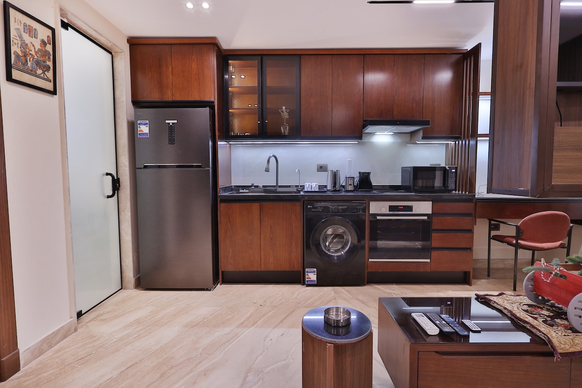 Moderan, potpuno opremljen stan na krovu u VYE SODIC New Zayed. Jedna spavaća soba, dnevna soba sa sofom na razvlačenje, potpuno opremljena ugradna kuhinja. Privatne prednje i zadnje terase sa barom na otvorenom, pametnim osvetljenjem u pergoli, ozvučenjem i roštiljem. Brzi Wi-Fi, 2 pametna TV-a, klima-uređaj u celom prostoru, radni prostor. Lift, parking, zeleno okruženje. Nekoliko minuta od aerodroma „Sfinga“ i Velikog egipatskog muzeja.