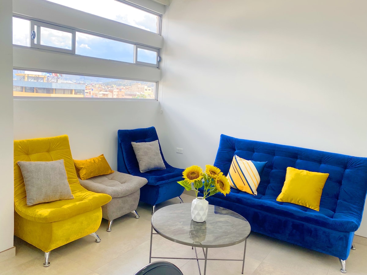 DEPARTAMENTO DE LUJO - 3 Dormitórios con camas y colchones nuevos - 2 Baños cómodos y elegantes - Sala americana con cocina, microondas, refrigerador y menaje de hogar - Garaje. * preguntar disponibilidad. - Sala con TV, internet, HBO Max, YouTube - Lavadora, secadora, plancha - Terraza con vista a todos los nevados que rodean la ciudad - Internet de alta velocidad Cerca del centro de la ciudad, universidades, centro comercial, supermercado Ambiente tranquilo, acogedor e ideal para descansar