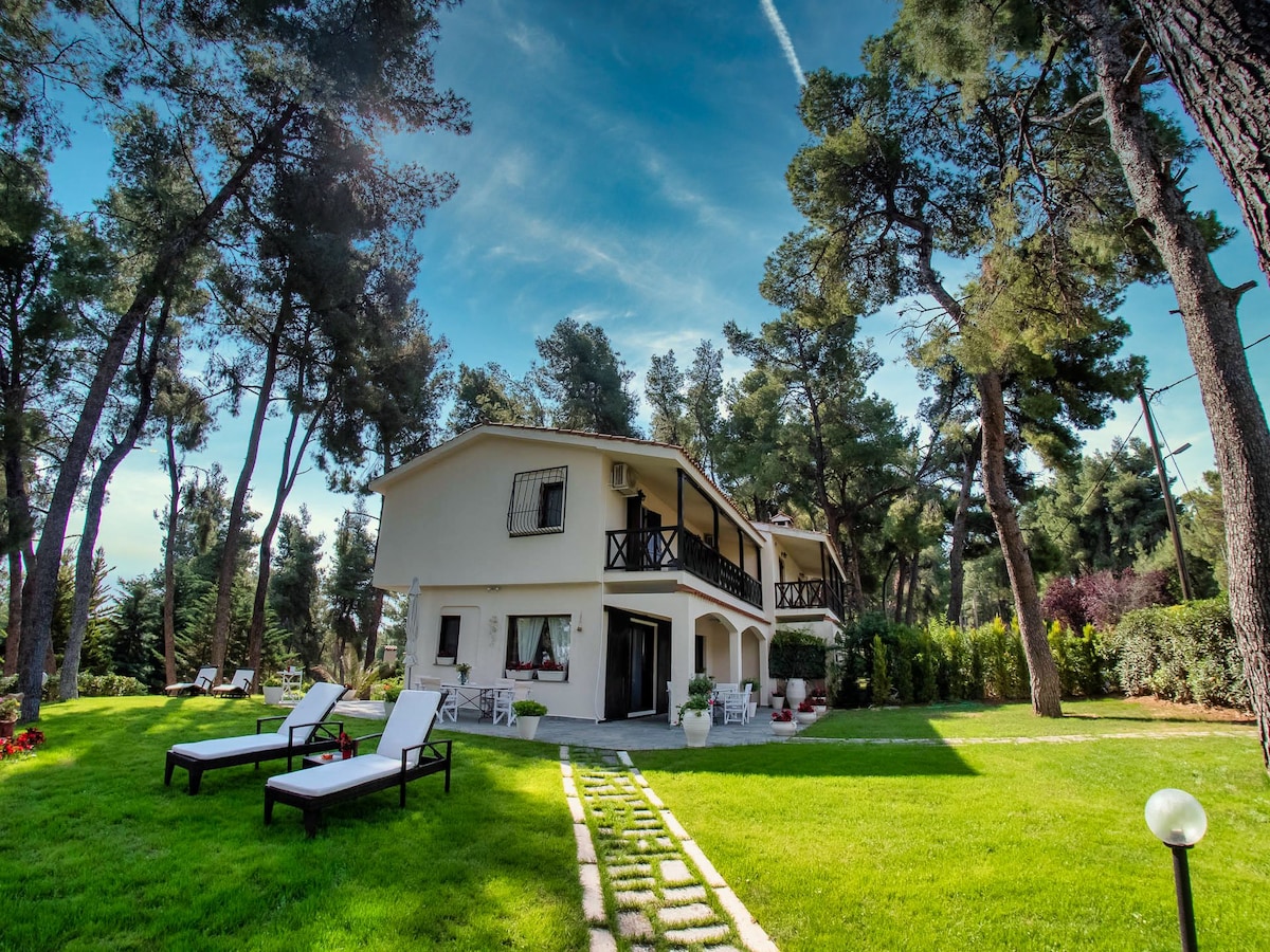 Obnovili smo porodični dom 1955. godine i povezali lokalni, tradicionalni element sa modernim načinom života. Imanje se nalazi na brdu nasuprot vizantijskog zamka Toroni i njegove poznate obale. Vila nudi neograničen pogled na more i planine. Obezbeđuje zelenu površinu od 500 m2, sa adekvatno uređenim prostorom za pravi odmor. Lokacija je bukvalno jedinstvena jer je blizu i u isto vreme daleko od mnogih.