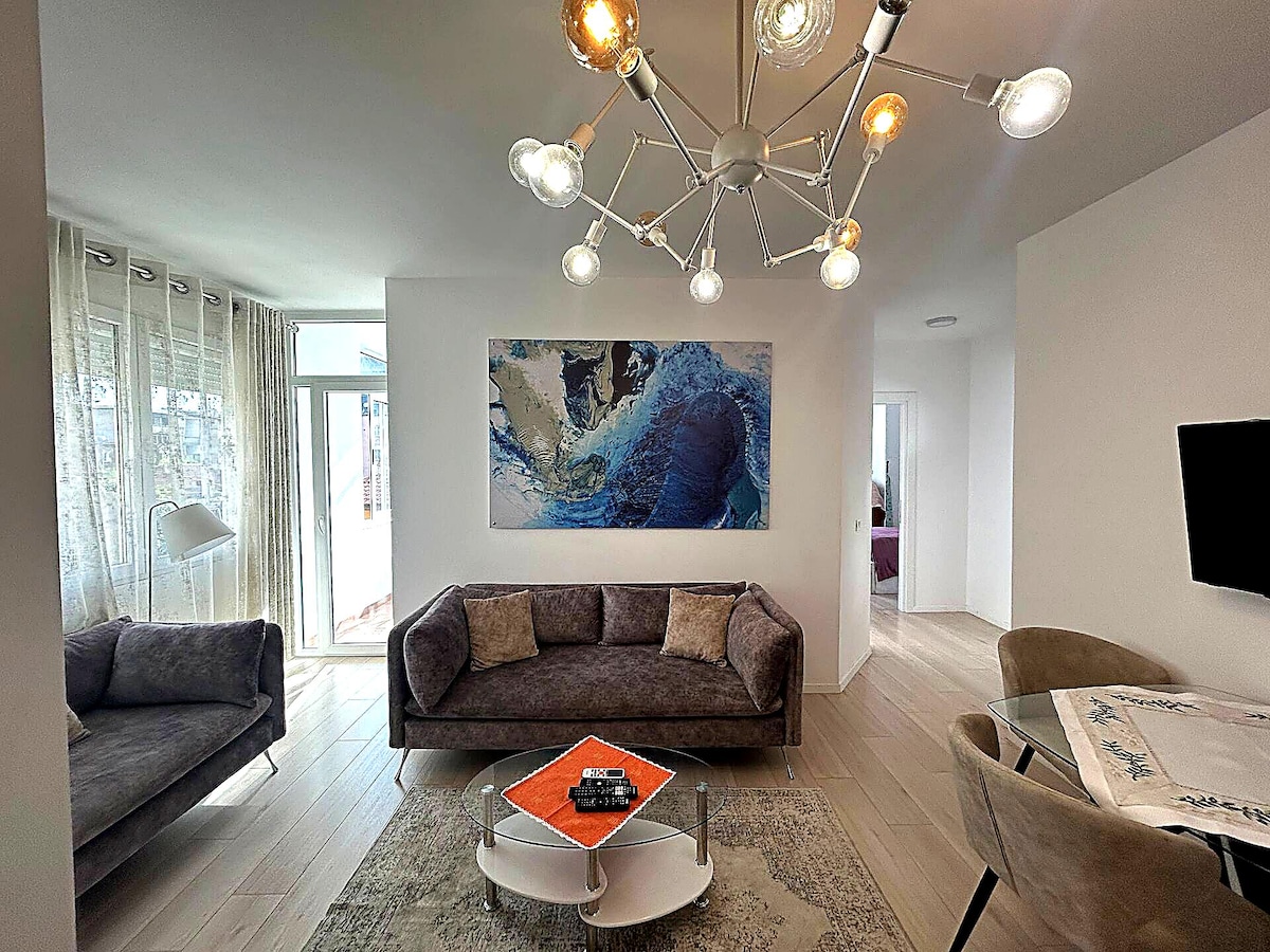 Stan se nalazi na savršenoj lokaciji, nalazi se na jednoj od najpopularnijih ulica,Drač i Mine Peza, ne trebaju vam autobusi ili taksi. Sa prozora možete vidjeti Skanderbegov trg ,Međunarodni hotel u Tirani,Nacionalni muzeji, opština Tirana, tržni centar Toptani.(3 min hoda). Jedinstven dizajn u kojem se kombinuju mir i udobnost. Opremljen svime što je potrebno u kući:klima-uređaj,TV, mašina za pranje veša,frižider, Wi-Fi,pegla,fen za kosu. Nećete se osjećati odsustvo doma