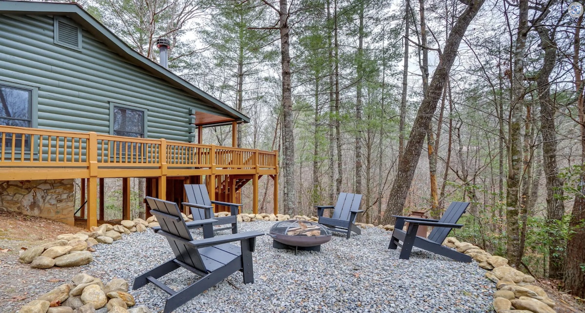 Serene 2BR/1Bath cabin on the Cartecay River. Enjoy 150 ft of private river frontage with a beach, rapids & fire pit. This light-filled 500 sq ft retreat features custom art, modern design & cozy details. Relax in the hot tub, watch a movie on the projector, or nap on the riverside bed swing. - Sleeps 4 | luxury linens + modern fixtures - Hot tub, bed swing, movie projector & outdoor fire pit - Direct river access for tubing & kayaking - Superhost care—always a message away