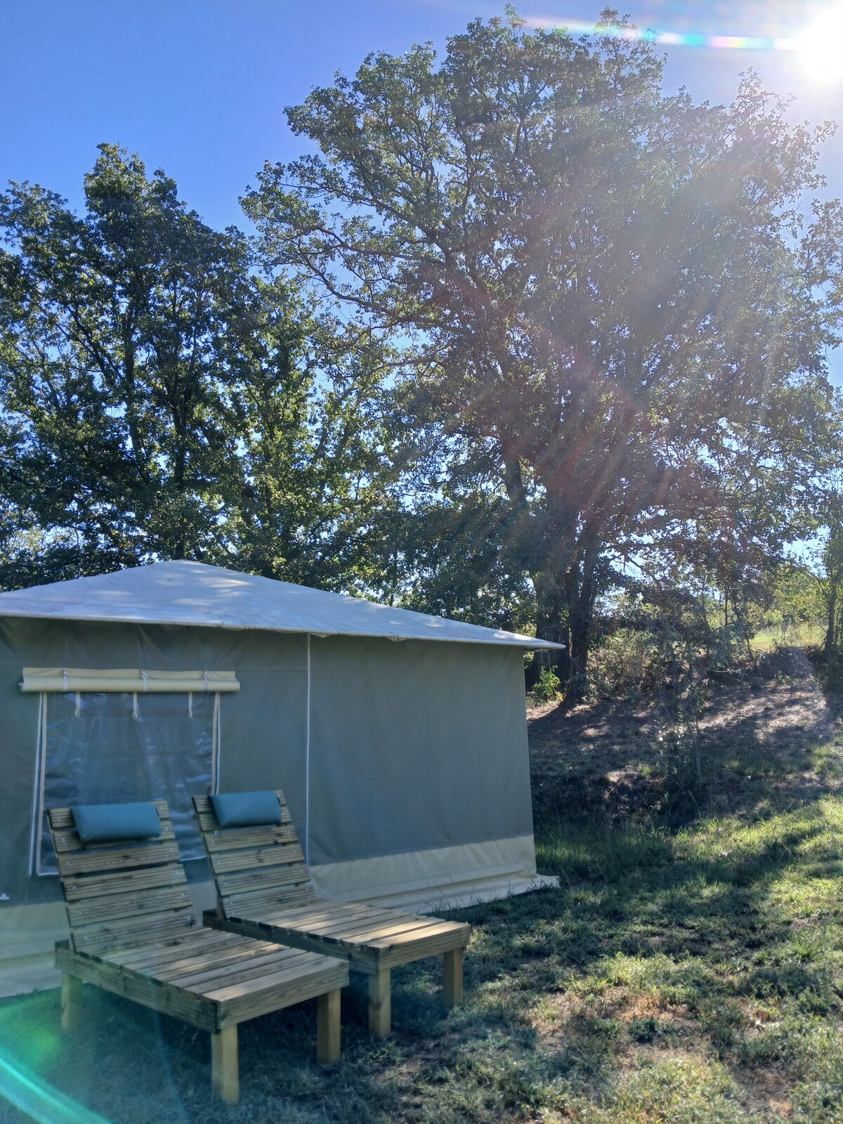 Kamp na farmi sa 5 bungalova na platnu i 1 ličnom šatorom. Svaki bungalov ima svoju dobro definisanu baštu, terasu, 2 spavaće sobe i kuhinju bez tekuće vode, ali sa šporetom i frižiderom, a samim tim i struju ( lampe, utičnice, ventilator ). Naći ćete krevete opremljene čaršafima, ćebadima i jastucima sa jastučnicama Porodična atmosfera u kampu. Zajedničke prostorije: toalet, zajednička soba, bazen, roštilj, pétanque igralište