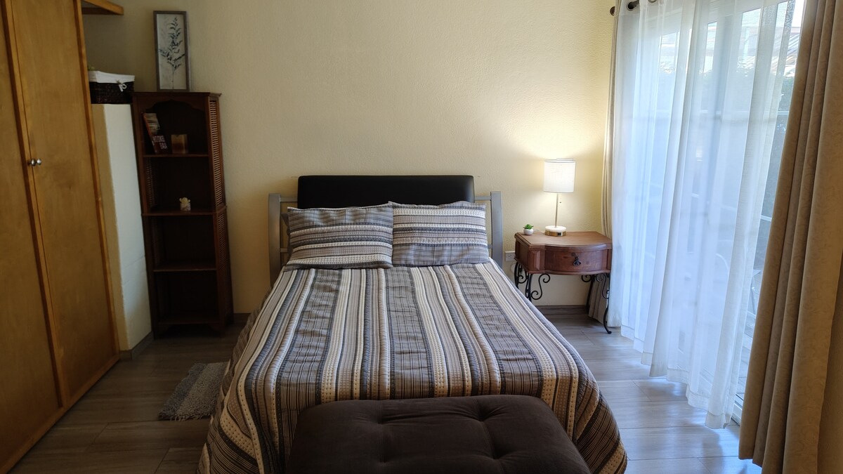 Probudite se uz pogled na zaliv u ovom udobnom potkrovlju, provedite dan istražujući ili opuštajući se i vratite se zlatnim zalascima sunca sa svog privatnog balkona — vrhunac svakog boravka. Cijeli zid prozora od poda do krova ispunjava prostor prirodnim svjetlom i prelijepim pogledom. Mirno i na dobroj lokaciji: 5 minuta do 🛍️ Kale Primere, 15 minuta do 🏖️ Plaja Hermose i u blizini vinske rute 🍷 Valle de Guadalupe. Savršeno za romantični odmor ili inspirativno utočište.