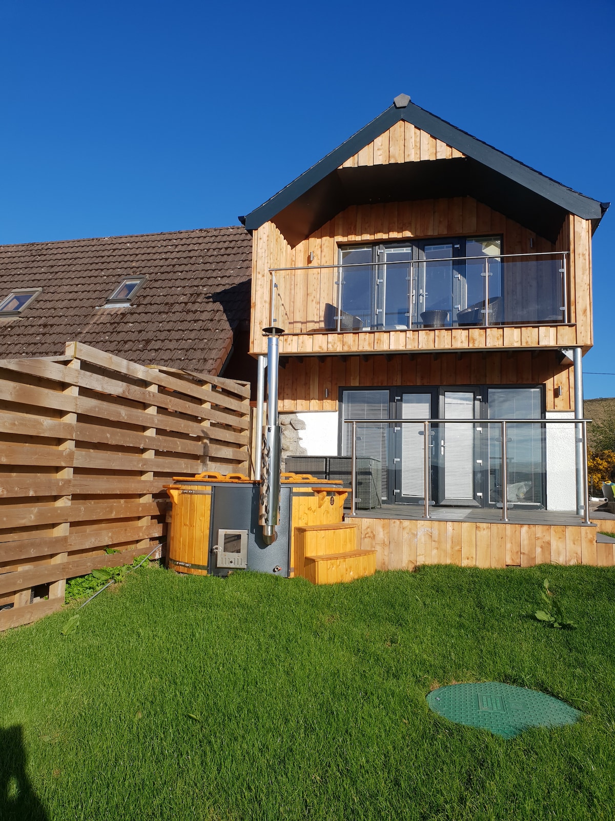 Dobro došli u Highland Huts, koji se nalazi u srcu Škotskih visoravni. Pet minuta vožnje od idiličnog sela Drumnadrochit i Loh Nes. ‘Evelyn’ ‘Rose’ i ‘Violet‘ cabins su idealni za one koji traže opuštajući odmor sa veličanstvenim pogledom i fantastičnim obližnjim šetnjama. U kompletu sa natkrivenom spoljnom terasom, u kojoj se nalazi hidromasažna kada sa ekološkim gorivom (hidromasažna kada će biti do temperature oko 1,5 sat nakon vašeg dolaska, nakon što ste je uključili!)i roštilj.