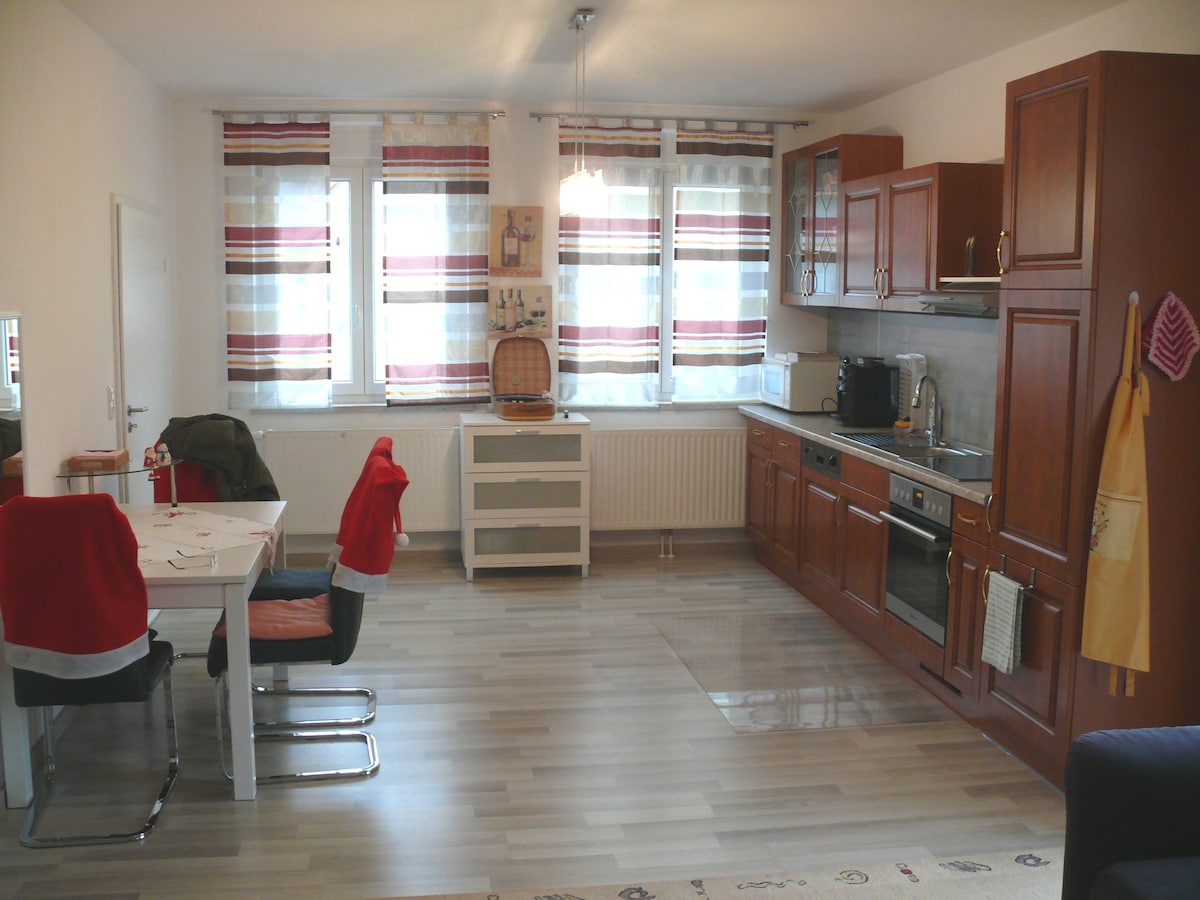 31 m² studio apartment with terrace ♥ Queen-size bed & high-quality sofa bed for 2 additional guests ♥ Terrace with seating area & private barbecue ♥ Modern, fully equipped kitchen including microwave & coffee machine ♥ Cosy dining area for up to 4 people ♥ Smart TV with Disney+ & fast WiFi access ♥ Stylish bathroom with XXL shower ♥ Baby cot & high chair available ♥ Washing machine & dryer in the house for free use ♥ Free parking in front of the door
