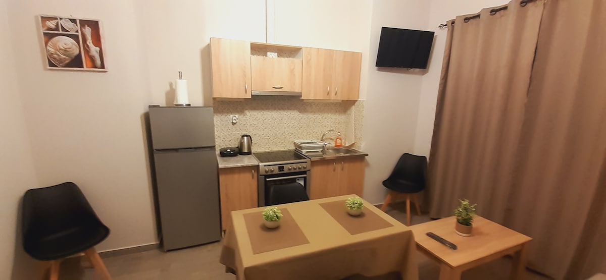Stan u prizemlju površine 30 m2 u centru Ermoupolisa. Ima sve što vam je potrebno za udoban i prijatan boravak. Oko 5 minuta hoda (500 metara) od luke, centralnog trga Miaouli, glavnih ulica sa prodavnicama, kafićima,restoranima, barovima. Jednostavan parking i nekoliko metara od besplatne opštinske autobuske stanice. U nekoliko metara nalazi se velika SUPER PIJACA, pekara, prodavnica, mesnica, apoteka i bolnica Siros.