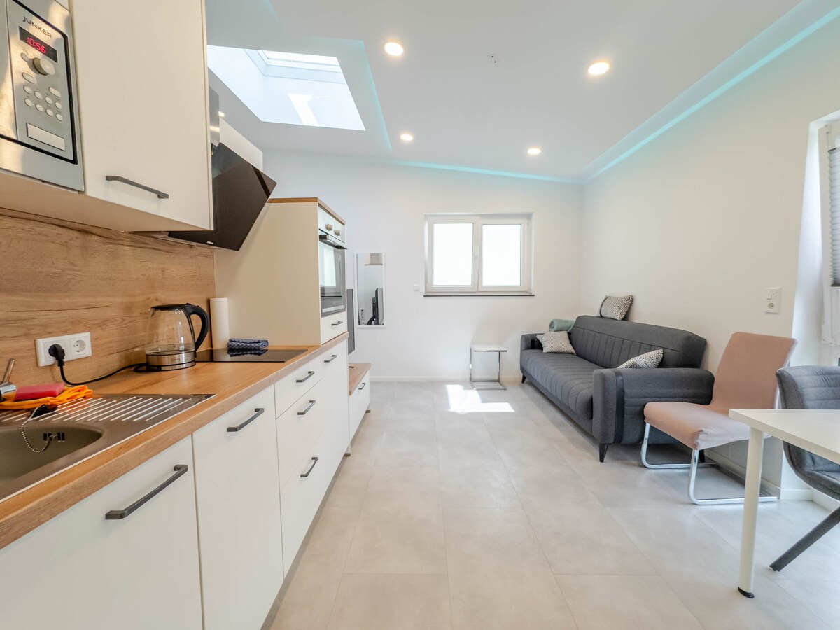 Dobro došli u svoje elegantno utočište na mirnoj lokaciji u Erzhauzenu. Svetli galerijski stan sa otvorenom kuhinjom, trpezarijom i udobnim dnevnim boravkom (uključujući kauč na razvlačenje) nudi vam dovoljno prostora za dolazak. Zasebna spavaća soba, potpuno opremljen radni prostor u galeriji i malo kupatilo sa tuš-kabinom pružaju udobnost u cijelom prostoru. Idealno za kratke boravke, radne odmore ili samo nekoliko dana na centralnoj lokaciji između Darmštata i Frankfurta.