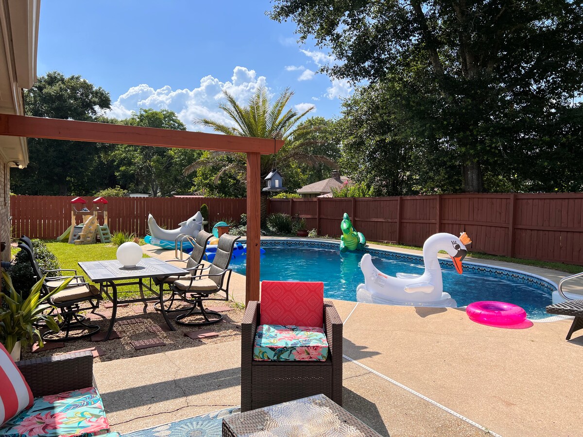 Opustite se i napunite baterije u ovoj prostranoj i elegantnoj porodičnoj kući za odmor. Odlično za velike porodice koje mogu da dele jer imamo DVE primarne spavaće sobe sa zasebnim apartmanima. Udobno spavamo 12 osoba u ovom domu sa 5 kreveta/3 kupatila, sa 7 kreveta. Nalazi se u neobičnom i mirnom delu grada na manje od 10 minuta od plaže Pensakola, na milju od javnog pristaništa za brodove i mnoštvo obližnjih aktivnosti, uključujući bioskop, mini golf i zoološki vrt. Uživajte u privatnom bazenu i ponesite i fido! (čeka se odobrenje/naknada za kućne ljubimce)