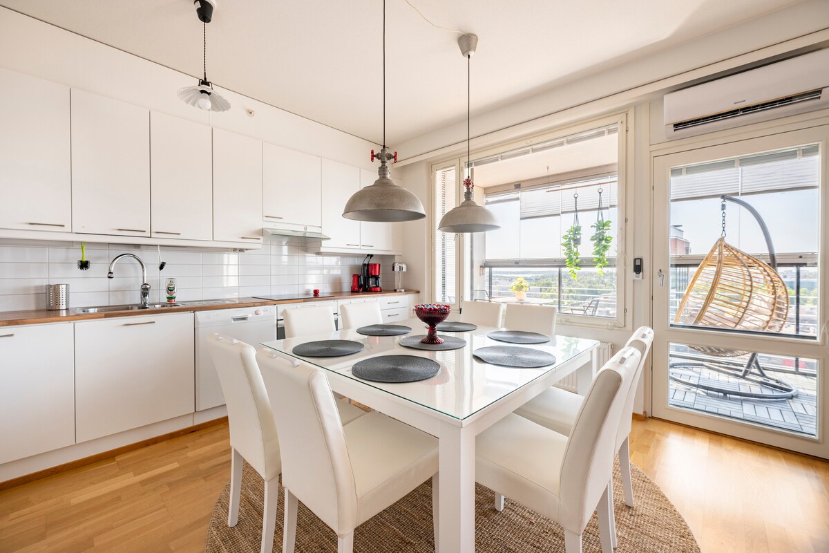 Ovaj stan vredi iskusiti! Stan ima mnogo zapanjujućih detalja: Sa 18. sprata Kuće Tauer, možete da se divite predivnim zalascima sunca koji oduzimaju dah, uživate u elegantnom dekoru, da se opustite u sopstvenoj sauni ili da odete u susedni tržni centar u Sellu u kupovinu, bioskop, biblioteku, koncert ili restorane. Pored stana nalaze se i stanice javnog prevoza Leppävaara, a, na primer, vozom možete brzo stići do centra Helsinkija. Dobro došli da uživate!