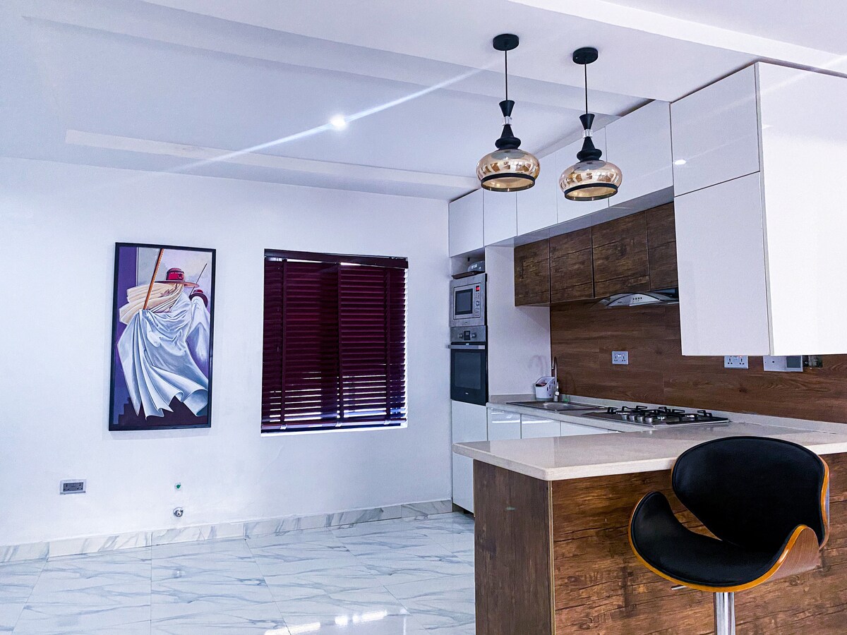 Potpuno opremljen minimalistički stan sa 3 spavaće sobe sa zasebnim sobama, toaletom za goste, opremljenom kuhinjom, liftom, snabdevanjem napajanjem i bezbednošću od 24 sata, Dstv-om i internet uslugom. Nalazi se u području Leafy, Serene i High Brow Ikoyi u Lagosu u Nigeriji sa jednostavnim pristupom svim delovima ostrva Lagos i kopna. Prostor odvojeni dnevni boravak i spavaća soba sa tuš kabinom Puna domaćica dostupna na licu mesta