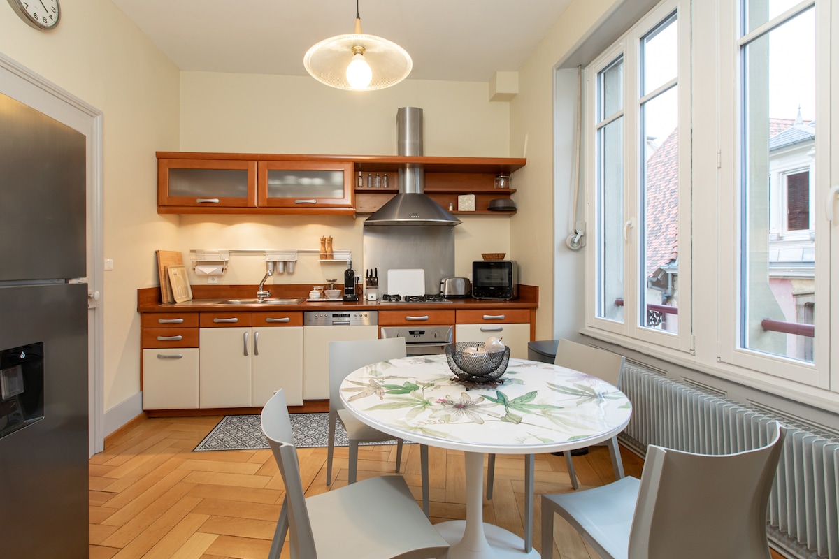 Smješten na gornjem spratu kuće iz 1790. godine, u hipercentru vrlo lijepog alzaškog grada Kolmara, ovaj dupleks u potpunosti renoviran 2018. godine zavešće vas svojim šarmom i udobnošću za odmor za dvoje. Uredan dekor se sastoji od: - u prizemlju, kupatilo sa tuš kabinom (peškiri su obezbijeđeni), velika potpuno opremljena kuhinja, dnevni boravak sa TV-om od 81cm - na spratu od kreveta od 140 cm (veoma čvrst dušek, posteljina) i odvojenog WC šolje