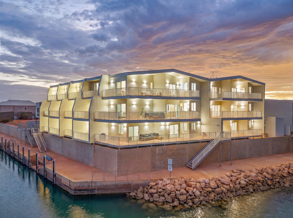 Welcome to your Exmouth retreat. • Canal-front townhouse with private jetty • Wrap-around balcony with water views • Sleeps 6 comfortably • Spacious open-plan living with 85” TV • Prime Exmouth Marina location Wake up on the water and enjoy a relaxed coastal stay in this brand-new, modern townhouse. Designed for comfort and easy living, it’s the perfect base for families, couples or groups looking to explore Exmouth and the Ningaloo Reef.