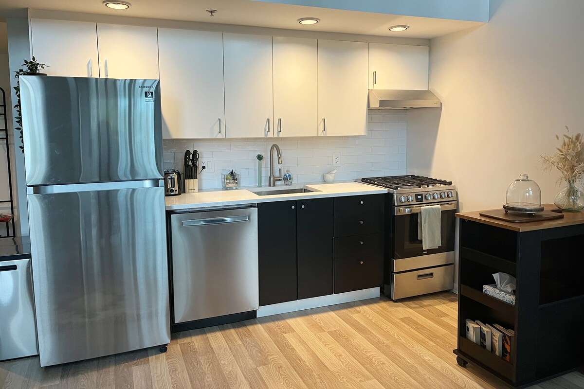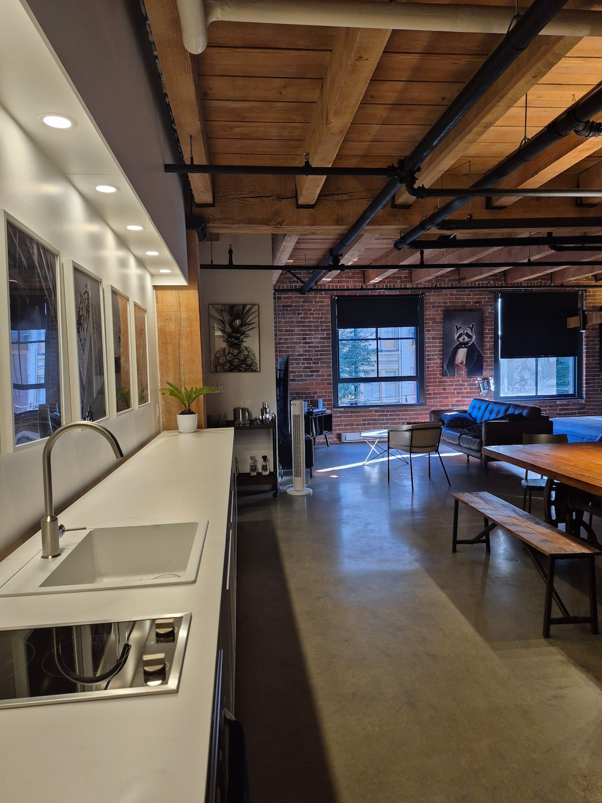 Welcome to my beautiful 1200 sq ft. New York style loft in downtown Vancouver's Gastown! This place is a true, fully stocked, home away from home with comfortable and stylish furnishings. Sit back on your couch and 58 inch smart TV, cook a meal in the fully stocked kitchen with a gas stove top, or enjoy a relaxing bath in your blue bathtub - the options are endless! Plus in-suite laundry (washer & dryer)!