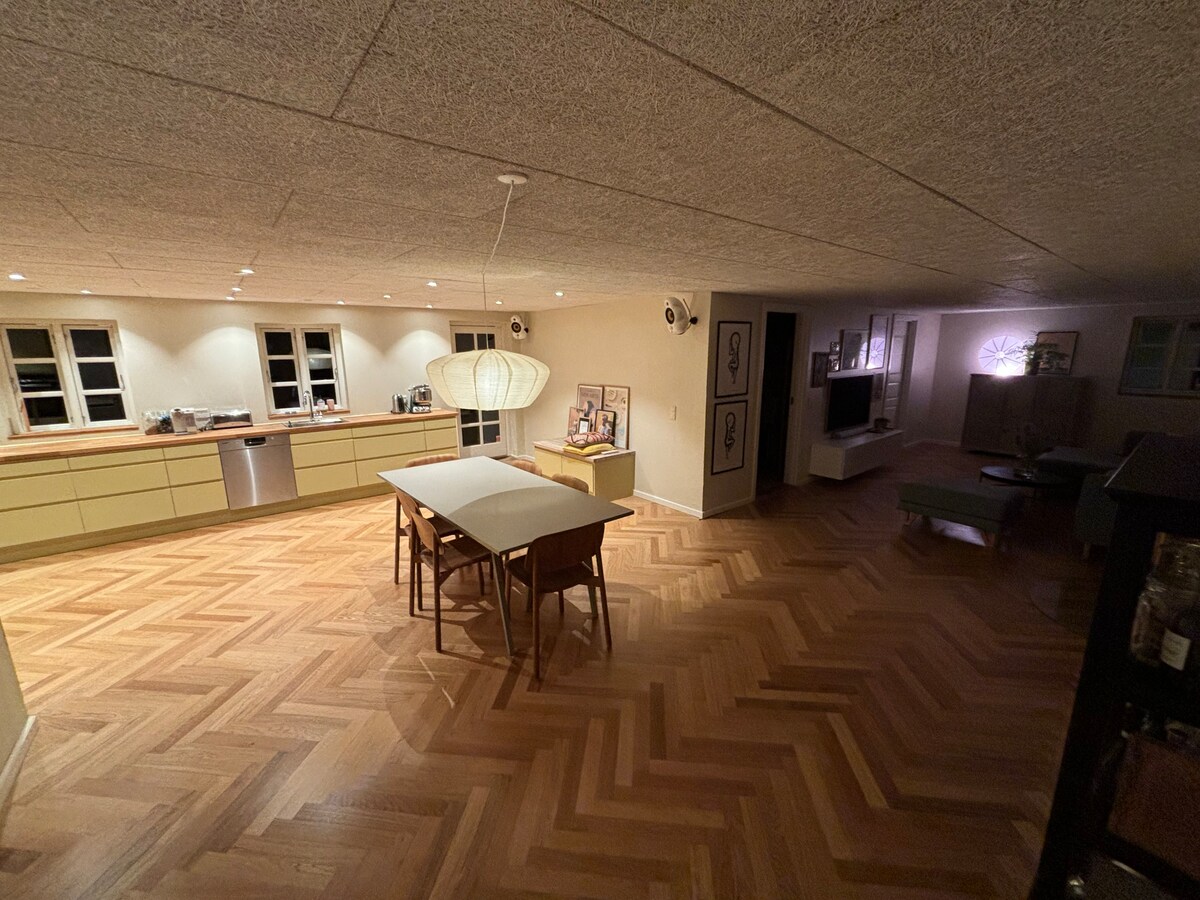 Velika svijetla vila u Risskovu. Komšija za parkiranje sa igralištem. 1 km do lijepe plaže i kafića prikladne za djecu. 2 km od šume. Dva kupatila, od kojih je jedno sa spa centrom. Zatvorena udobna bašta sa skloništem i večernjim suncem. Terasa je opremljena namještajem, roštiljem i grijalicom na terasi. Na terasi se nalazi i spoljni tuš sa toplom vodom. Privatni parking sa stanicama za punjenje električnih automobila. Spavaće sobe imaju bračni krevet 200x210, bračni krevet 140x200 i krevet za jednu osobu.