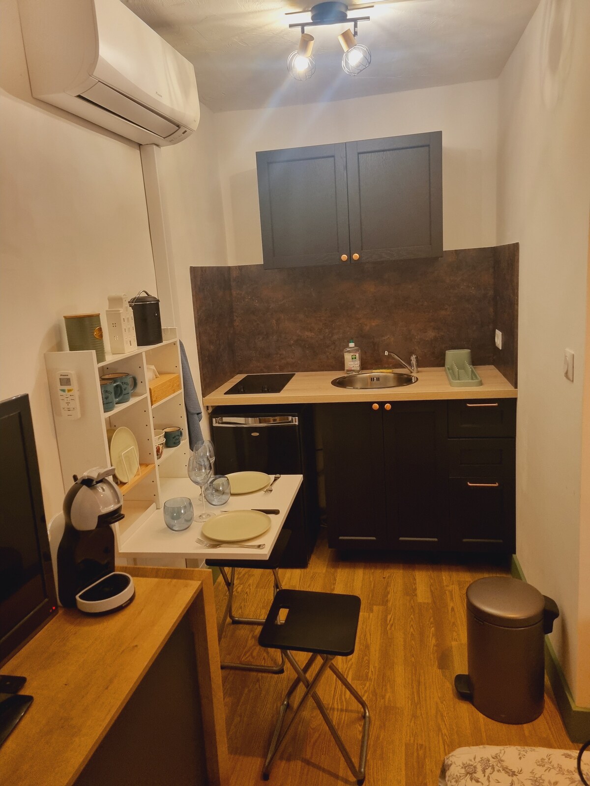 Mali studio od 14 m2, ali efikasan. Stepenice do tamo. 5 minuta hoda od centra sela Fajensa, parking mjesto, reverzibilni klima-uređaj, kafa, čaj, mikrotalasna pećnica, TV (netflix), garderoba. Na raspolaganju sam za svaki određeni zahtjev, živim odmah pored (isto sletanje). Pored moje kuće. Zaseban ulaz sa sefom za ključeve. 20 minuta od autoputa i 25 minuta od mora.