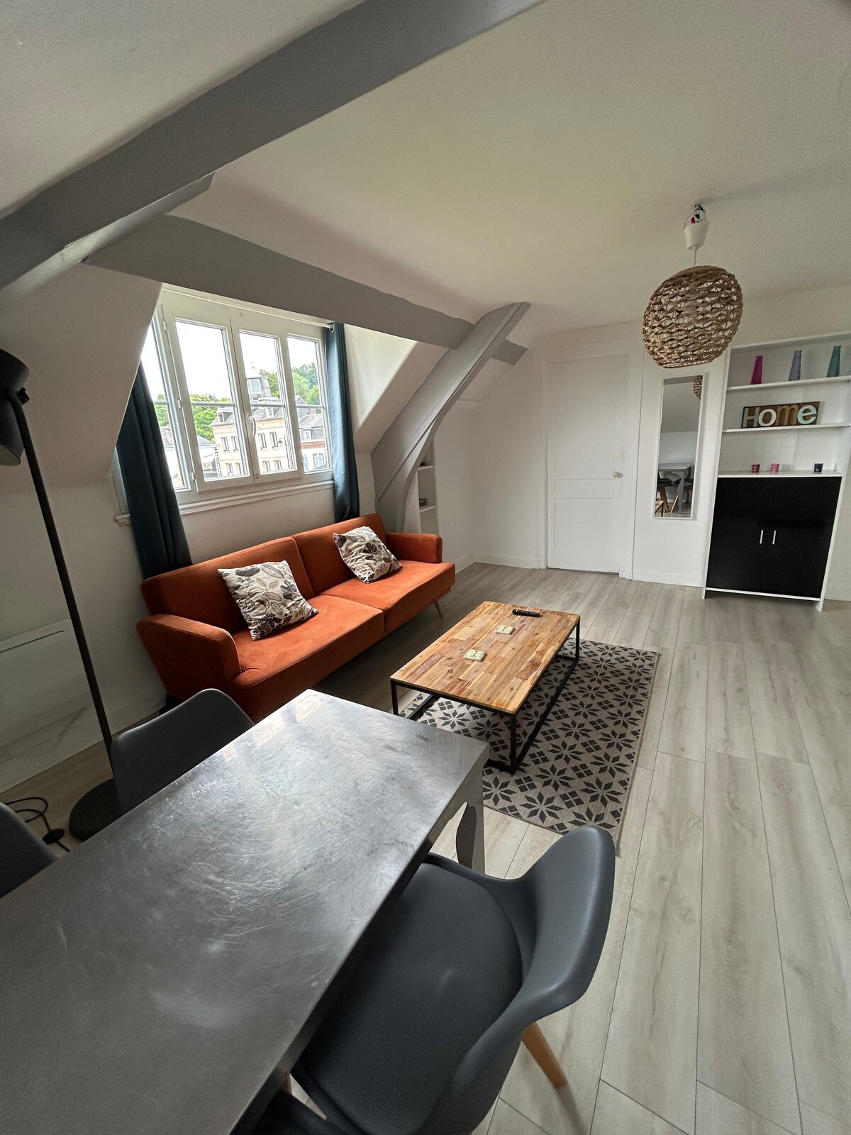 Prekrasan stan s pogledom na more u okrugu Fécamp, upravo je renoviran urednim dekorom, sastoji se od kuhinje otvorene prema dnevnoj sobi i glavnog apartmana sa veličanstvenim kupatilom, uključujući tradicionalnu saunu, kao i otmjenu balneoterapijsku kadu sa 72 mlaznice, sa kreveta se možete diviti veličanstvenom pogledu na more, kao i opatiji na vašim laticama 🌹 iz kreveta + boca dobrodošlice