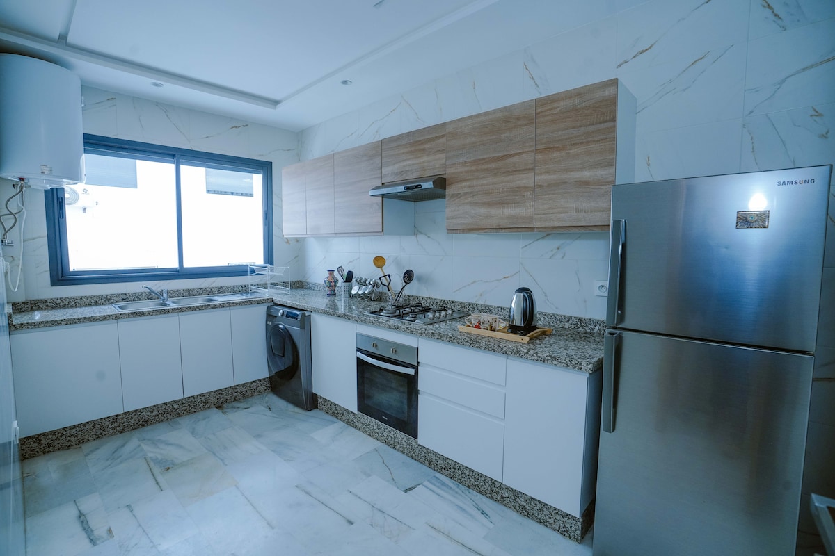 Luksuzan apartman u Prestigia Fčs – tih i bezbedan zatvoreni rezidencijalni kompleks sa danonoćnim obezbjeđenjem. ✅ 2 spavaće sobe sa vrhunskom posteljinom ✅ Svijetla dnevna soba, pametni TV, klima-uređaj ✅ Potpuno opremljena kuhinja ✅ Privatan balkon ✅ Brzi Wi-Fi Potpuno novo, moderno i besprekorno. Savršeno za porodice, parove i poslovne ljude. Udobnost od 5 zvjezdica u srcu Fesa.