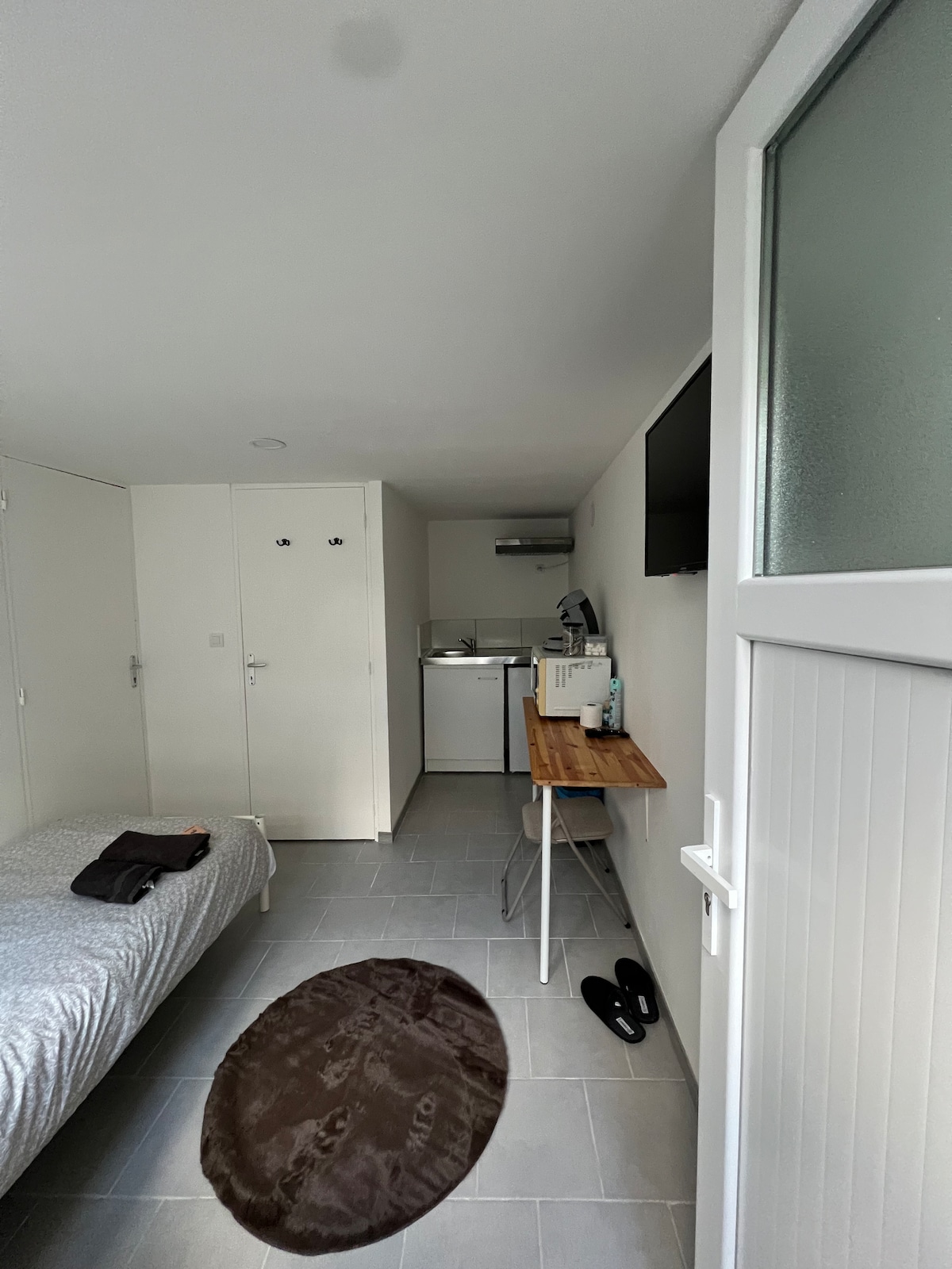 Mali studio od oko 18 m2, koji se nalazi preko puta parka Parc Jacquet. Opremljen je krevetom na sprat (1 sjedište) sa sofom odmah ispod (2 sjedišta), kupatilom sa WC šoljom i malom kuhinjom ( posuđe, ploča za kuvanje, mikrotalasna rerna, frižider...). Ima malu vanjsku zgradu sa mašinom za pranje veša. Tu je TV. Ovaj smještaj nije luksuzan, ali je vrlo funkcionalan. Pristup Wi-Fi mreži je ograničen na 40GO sedmično. Odlično za duži boravak: nekoliko sedmica do nekoliko mjeseci.