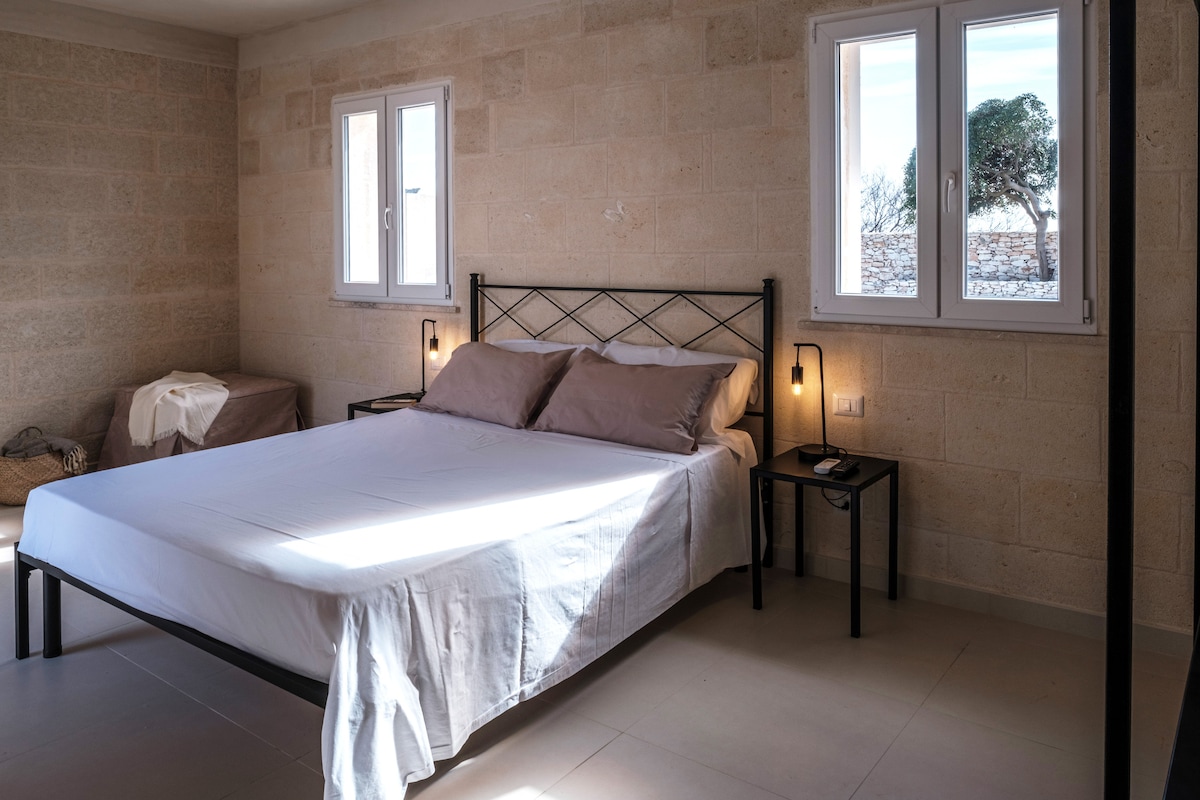 Renovirani trulo na mirnoj lokaciji na selu sa autentičnim stilom, većina enterijera je reciklirana ili stari namještaj preuređen na moderno funkcionalan način. Ima 1 dvokrevetnu spavaću sobu i 1 kauč u dnevnom boravku. Novouređeno kupatilo sa tušem,potpuno opremljenu kuhinju, mašinu za pranje veša i mnogo prostora na otvorenom (jedna terasa kojoj se može pristupiti iz spavaće sobe i jedna sa druge strane sa roštiljem Pristup bazenu dijeli se sa gostima druga 2 objekta (bez spoljašnjeg)