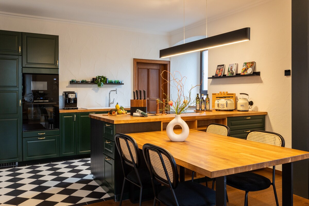 „Alte Schmiede” u šarmantnom dvorcu Lichter nudi vam izuzetan ambijent na 60 m². Vrijeme je za zajedništvo: U luksuznom velnes kupatilu, koje impresivno postavlja istorijske elemente prošlih vremena, pogledajte svjetlo kamina potpuno opušteno iz đakuzija. Elegantna kuhinja-dnevni boravak, kao i spavaća soba sa šarmom potkrovlja, impresivno se odlikuju impozantnim zidovima od pješčenjaka. Uživajte u nezaboravnim satima u istorijskom dvorcu na vodi!
