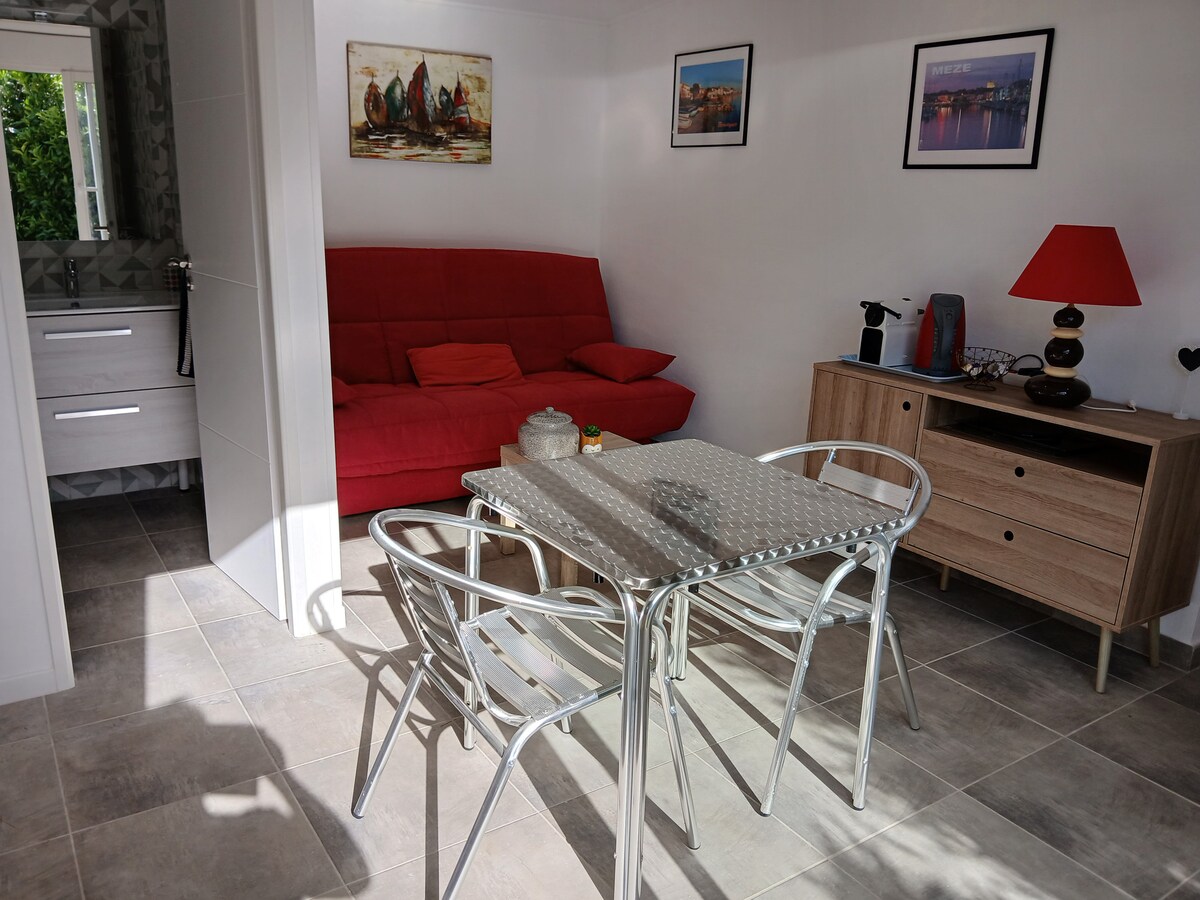 Cabane au sein d'un domaine arboré Mont St Clair, avec une terrasse vue sur la ville, le port et la mer à l'abri des regards en 2 espaces privatifs reliés par un escalier extérieur. Niveau inférieur fermé : Chambre 12m2 avec lit 160, toilettes Niveau supérieur : Salle d'eau douche, cuisine d'été de 6m2, ouverte sur une terrasse de 8 m2 avec table Buanderie commune avec lave linge et sèche linge Accès piscine collective ( non chauffée) de 09h à 19h. Parking gratuit côté chambre pour 1 véhicule