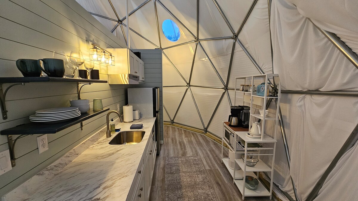 Pozdrav i dobrodošli u svoj Alien Dome Retreat, smješten među veličanstvenim hrastovima. Otkrijte retro-futurističko potkrovlje, udoban životni prostor sa kosmičkim dekorom i ognjište za posmatranje zvijezda pod ogromnim noćnim nebom. Postoji mnogo razmaknutih tematskih artefakata, društvenih igara i gramofona. Istražite lokalne staze u prirodi, pecajte u obližnje vode i uronite u jedinstveni spoj zemaljske udobnosti i vanzemaljske privlačnosti u području 1609. 🛸🌌