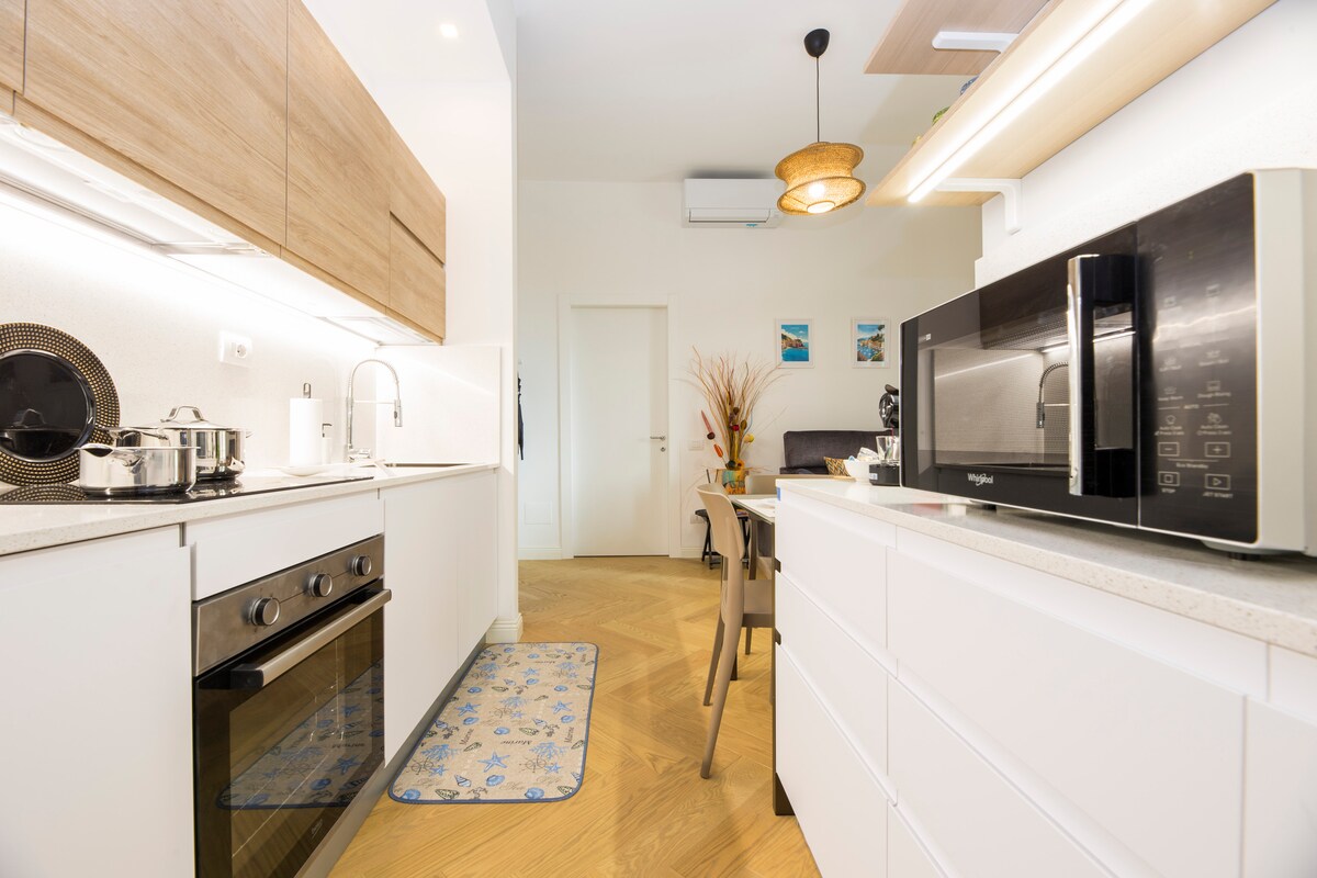 Elegantan i svetao stan Pogled na centralni trg Matteotti Nasuprot čuvenog Palaco Dukale Sastoji se od: -1 istaknuti otvoreni dnevni boravak sa udobnim kaučem na razvlačenje i visokim plafonom sa freskama -1 otmjena trpezariju sa dizajnerskim stolom i stolicama -1 moderna kuhinja uz svu udobnost -1 dvokrevetna soba koja se nalazi na mezaninu s pogledom na dnevnu sobu takođe je osvetljen sa 3 veličanstvena prozora -1 moderno kupatilo sa staklenim tušem