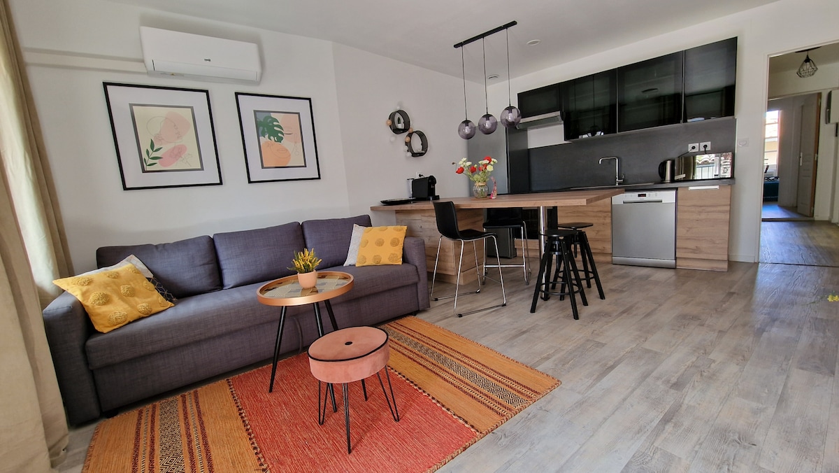 Novi stan T2 (43m²) miran sunčan 7 minuta hoda do centra Foa. Vrlo blizu stadiona Žan Surre. Spavaća soba sa bračnim krevetom + dnevni boravak sa sofom Potpuno opremljena kuhinja sa mini rernom, mašinom za pranje sudova, mašinom za pranje veša, frižiderom sa zamrzivačem, mikrotalasnom rernom, Delonghi aparatom za kafu Privatni vrt sa stolom i 2 stolice, suncobranom, kao i 2 ležaljke za sunčanje, stolom za stoni tenis. Ovu baštu dijeli mačka koja slobodno luta. Parking na ulici je dostupan.