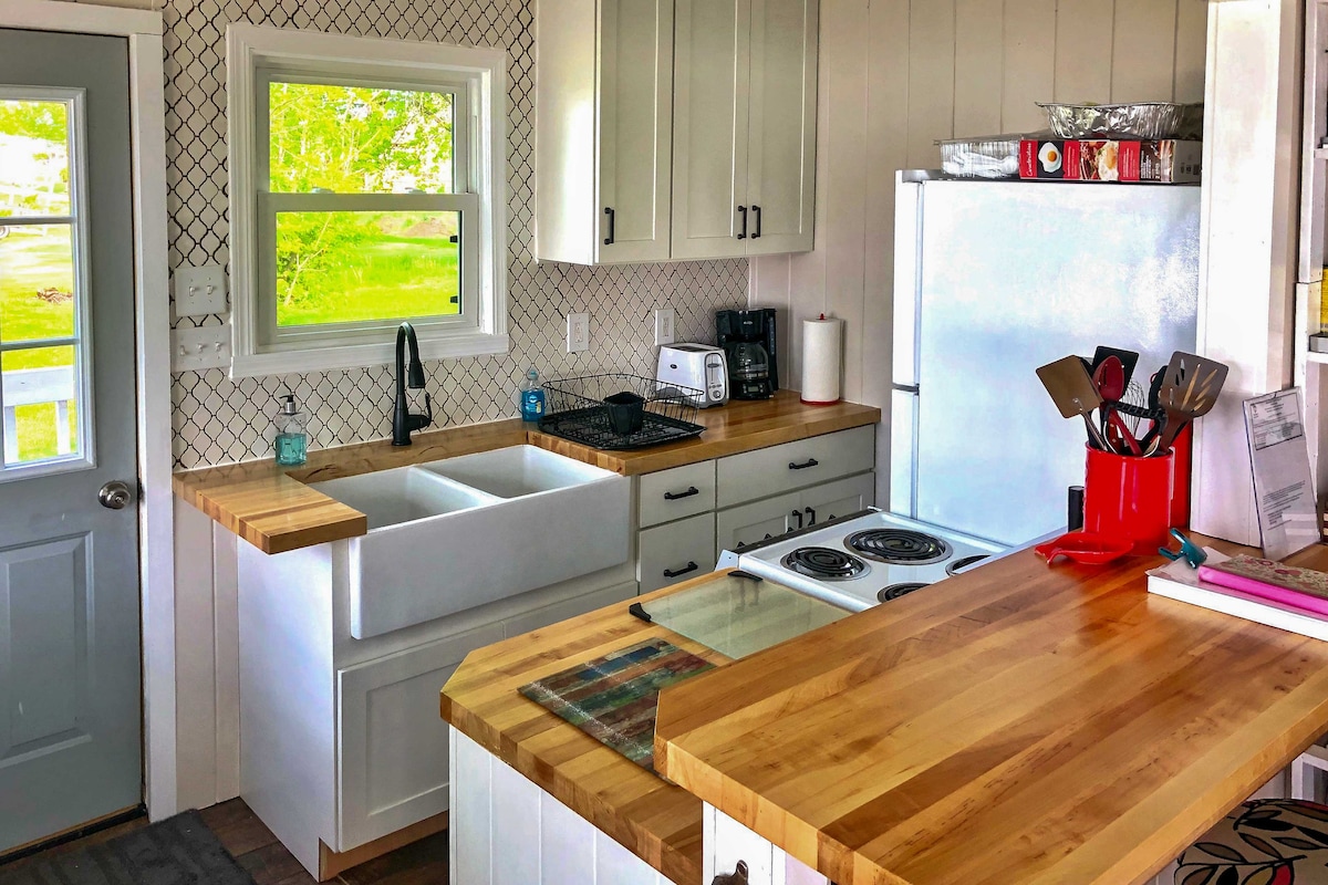 Uživajte u modernom i vintage šarmu naše nedavno ažurirane seoske kućice. Udoban, ali otvoren tlocrt sa velikim prozorima i vratima dvorišta omogućava vam da uživate u mirnom pogledu na vodu i divlje životinje ispred vaših vrata. Naše potkrovlje na spratu ima 2 kreveta i služi kao treća spavaća soba. Dolje je potpuno opremljena kuhinja, prostrana trpezarija, dve spavaće sobe sa dovoljno prostora za ormar, vešernica sa mašinom za pranje i sušenje veša, tako da možete da uživate u svim udobnostima doma.