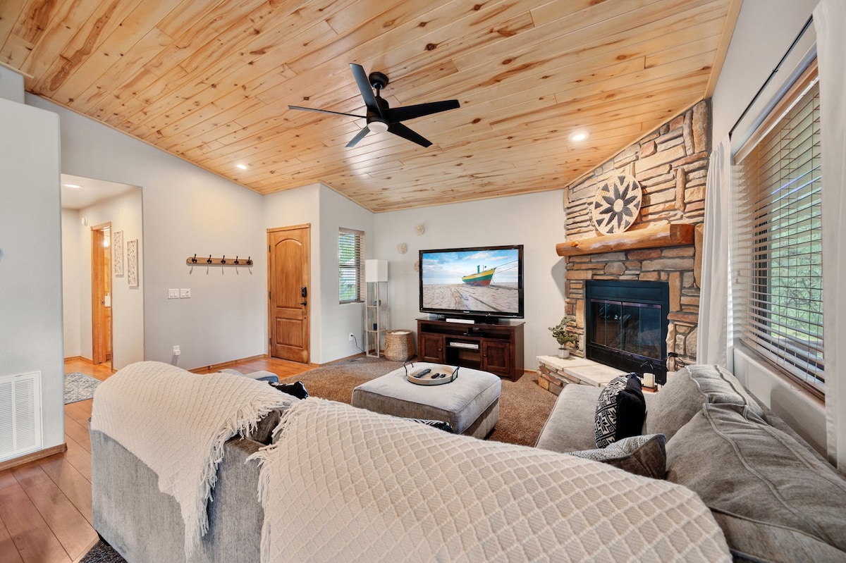 DOBRO DOŠLI u udoban smještaj. Ovo je SAVRŠENO MESTO za odmor! Elegantan 2 BD/ 2 BA koji takođe ima unutrašnji kamin, 2 garaže za automobile i prednju i zadnju terasu! Potpuno nova konstrukcija, sagrađena 2022! Uključeno je i: * Garaža za 2 automobila * Podijeljeni tlocrt omogućava privatnost * Udobni prostori za sjedenje koji će vas okupiti za razgovor, TV i igre * Uživajte u natkrivenom dvorištu s pogledom na nacionalnu šumu To je savršen odmor za svakoga ili povedi celu porodicu.