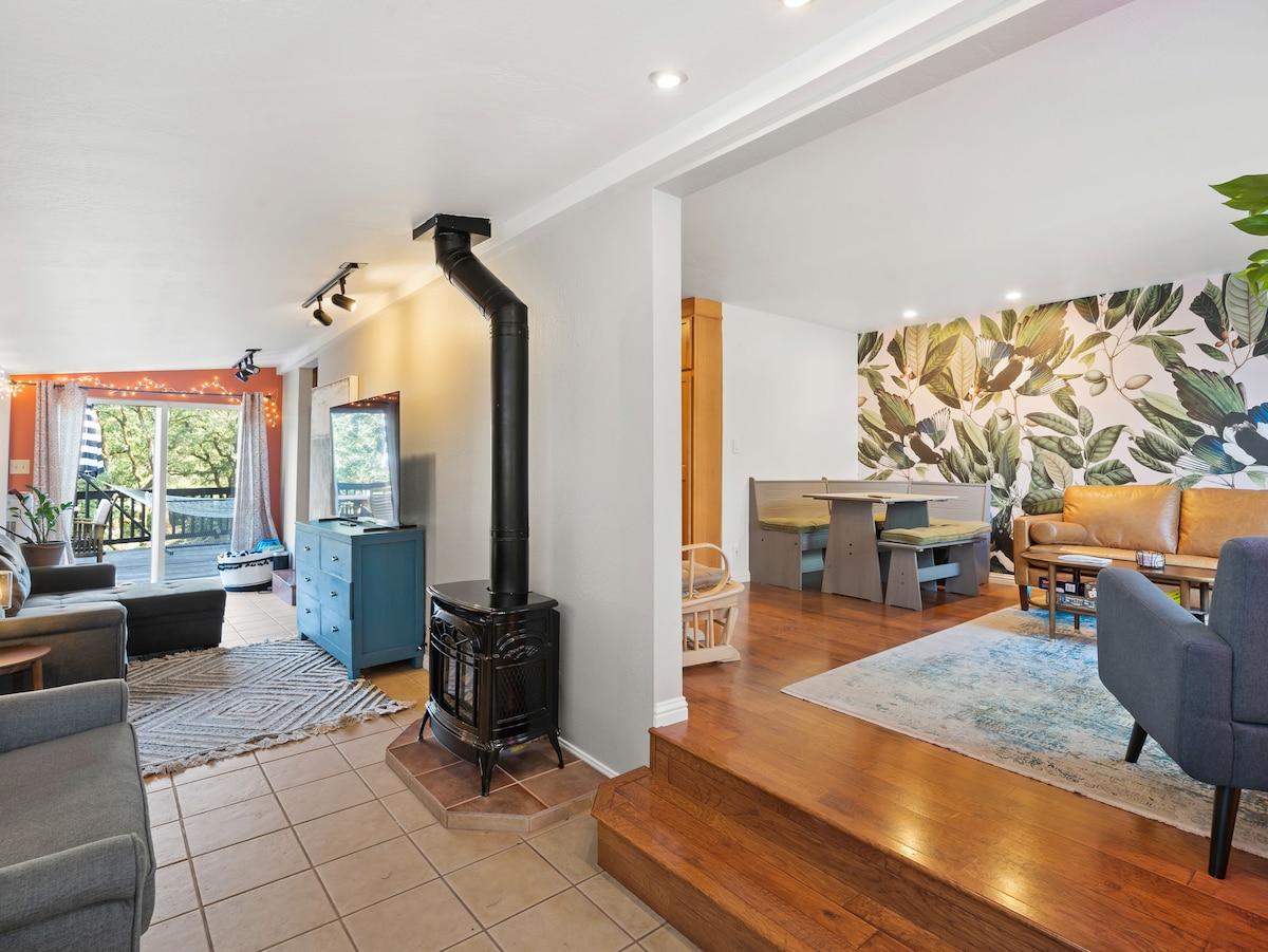 Udobno utočište smešteno u srcu vinske zemlje. Naš šarmantni dom nudi miran odmor okružen stablima sekvoja koja oduzimaju dah. Opustite se na 3 privatne terase dok pijuckate jutarnju kafu ili se opustite u privlačnom životnom prostoru. Spavaće sobe obećavaju miran san, a vrhunska potpuno opremljena kuhinja omogućava domaće obroke. Praktično u blizini vinarija, planinarenja i ruske reke, naš sunčani šumski odmor je savršeno odredište za ljubitelje prirode i avanturiste.