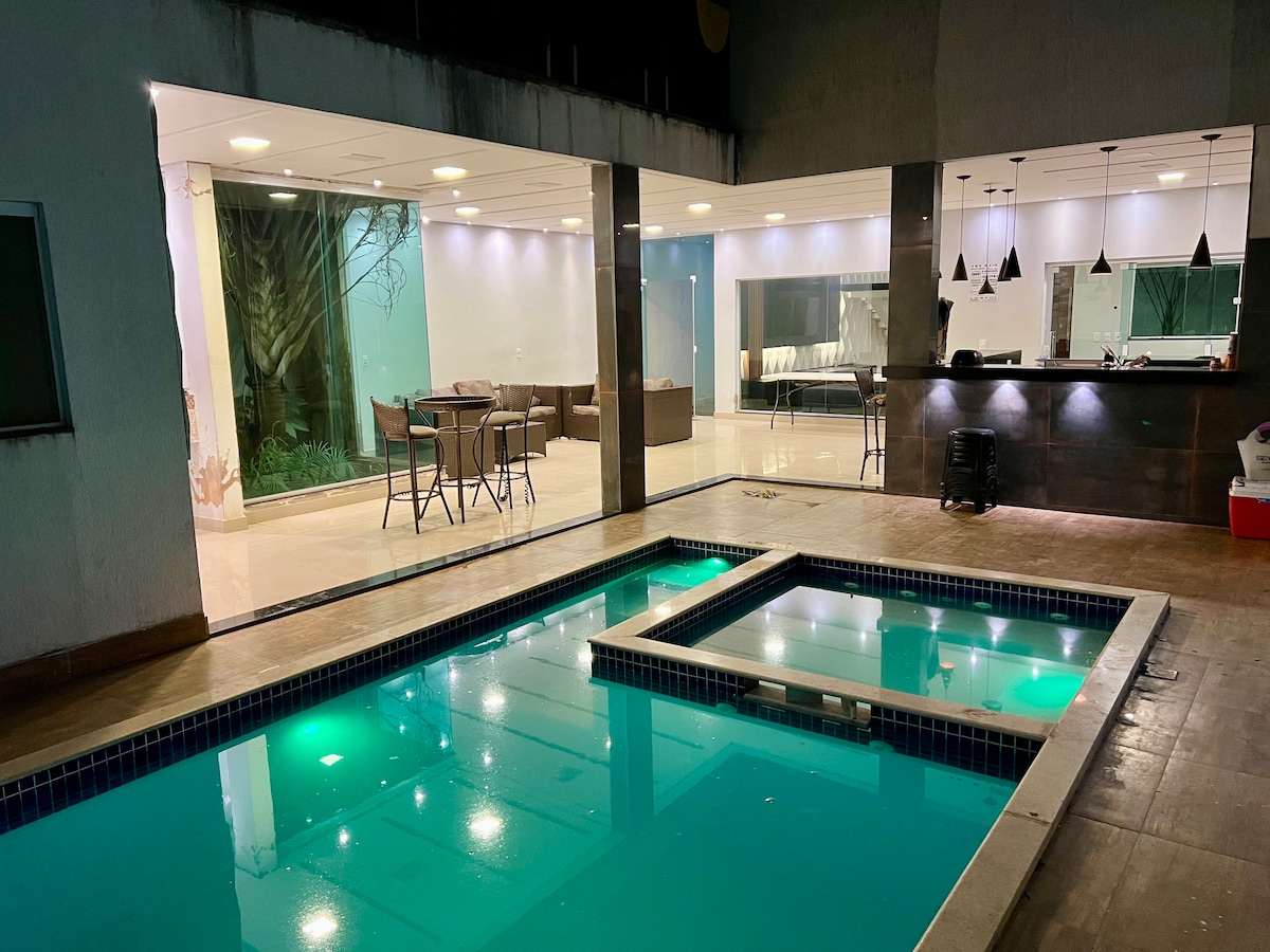 Clique em reservar e garanta sua hospedagem com tranquilidade! A Casa Mahalo é perfeita para reunir família e amigos em Brasília! Espaço amplo e completo para até 10 hóspedes. Com piscina e jacuzzi aquecidas, cascata, churrasqueira completa, ambiente privativo e espaços confortáveis com wifi de alta velocidade. Localizada em condomínio fechado no Jardim Botânico a 25 minutos do centro de Brasília, com segurança 24h e amplo comércio próximo ao condomínio. Faça sua reserva e aproveite!