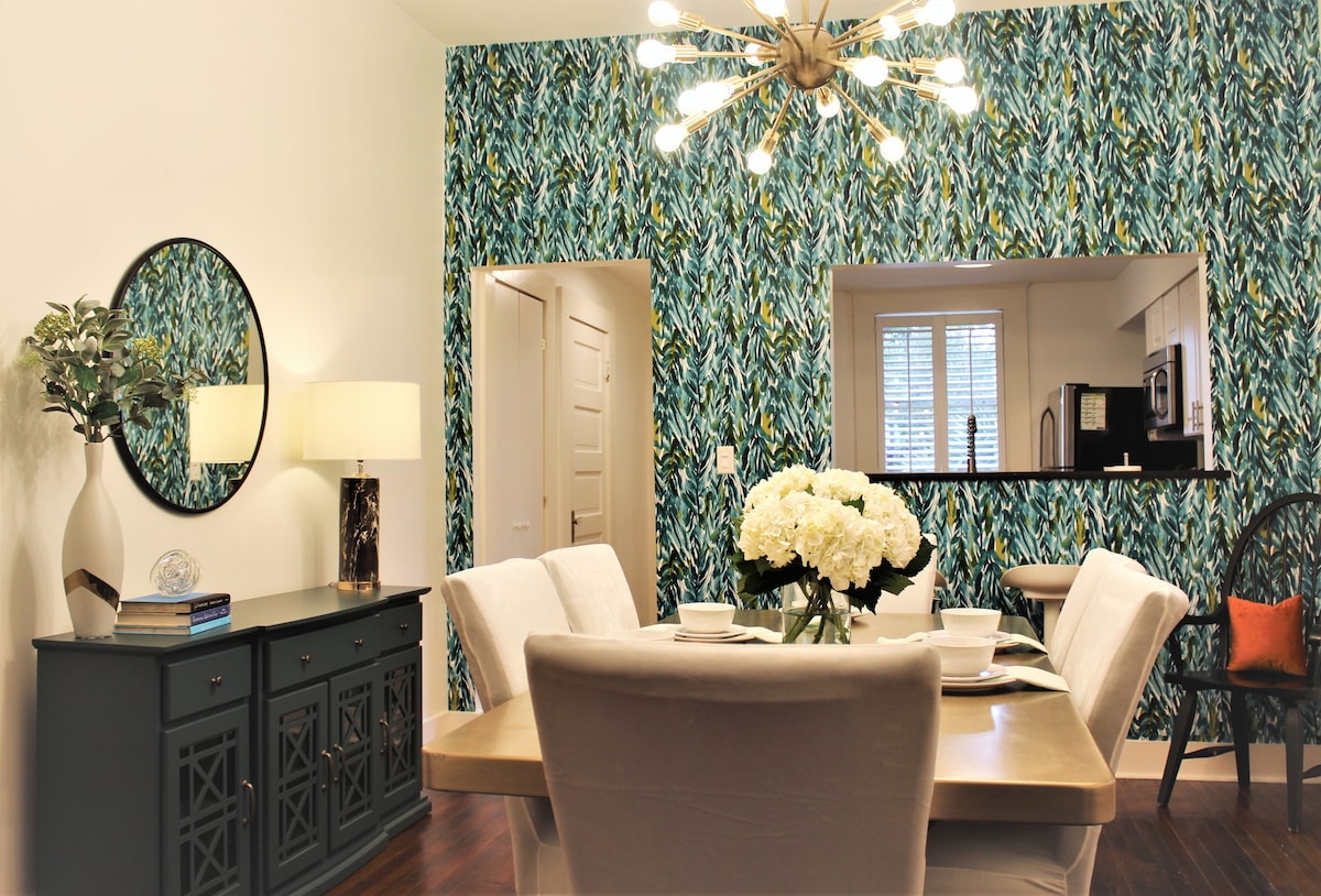 Povedite porodicu i kućne ljubimce u kuću breskve! Popnite se stepenicama do vrhunskog smještaja: 2 spavaće sobe, 2 renovirane jedinice sa kupatilom u srcu Savane. Pješačka udaljenost (0,3 milje) do parka Forsythe u Viktorijanskom okrugu. Novi smještaj u viktorijanskom stilu sa modernim sadržajima. Šetnja do četvrti Kolins (0,4 milje), 700 Drejtona (0,4 milje), Mate Factor (0,2 milje). Privatni parking u sklopu objekta koji se nalazi izvan ulice. Ograđeno, dobro osvijetljeno dvorište sa potpuno novim ekološki prihvatljivim travom i ognjištem od cigle.