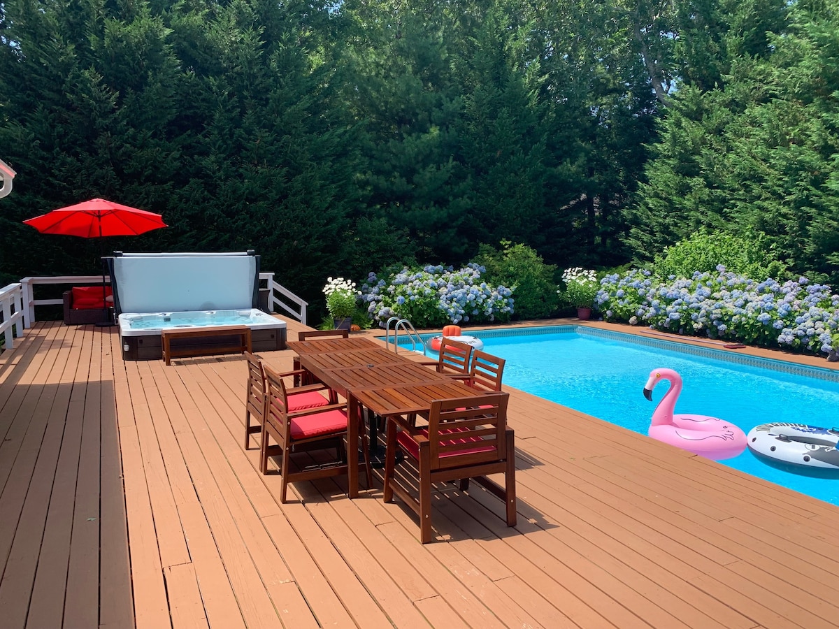 Escape to your chic, serene Hamptons oasis! Enjoy the privacy of your own home just steps to waterfront dining + more Relax poolside, spark up the BBQ + firepit under the starry sky, swim + enjoy the peace + tranquility of this property. Enjoy easy living + convenience; walk 1 block to waterfront dining + cafe. Sip cocktails while you watch the most magnificent sunsets + have morning coffee on the sea. Stream on your 80' TV You'll be 8 minutes to Main St, shopping, beaches, restaurants + more!