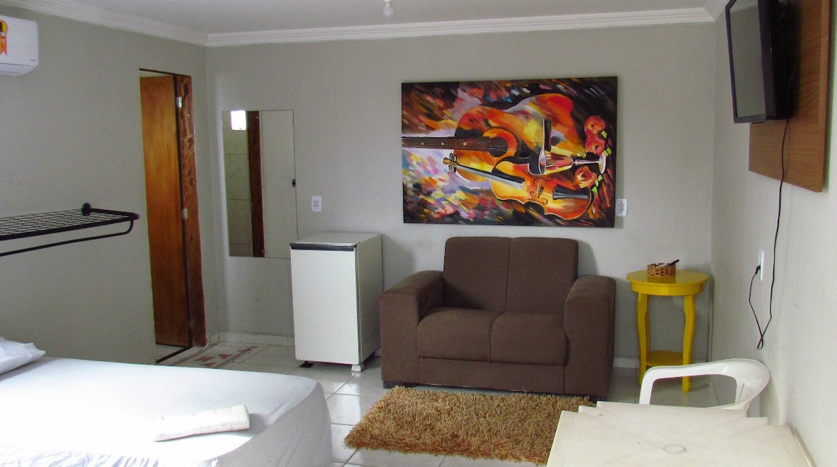 Privatni apartman u pansionu sa doručkom, sa klima-uređajem i 1 bračnim krevetom, TV-om, ormarom, internetom. Privatno kupatilo u apartmanu. Imamo mikrotalasnu rernu, šporet i frižider u zajedničkoj kuhinji za brze obroke!! 500 metara od autobuske stanice i 3,9 km od aerodroma. 5 km od centra Fortaleze i 6 km od plaže Iracema. Rua Coronel Amâncio Cavalcante 61 bairro de Fátima. Porodična lokacija