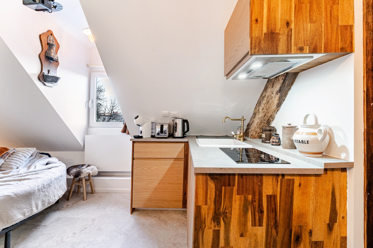 Gabrijela i Bendžamin vas dočekuju u starom ambaru u svojoj kući koju su pažljivo opremili da je pretvore u svetli studio površine 27 m2. Uređenje je moderno moderno i šareno za dnevnu sobu i neo-retro za tuš kabinu. Kuhinja/trpezarija ima osnovnu opremu za zagrevanje ili kuvanje jednog jela. Nalazi se u zaseoku Balon sa pogledom na grad i nudi vam mir i udobnost za boravak od najmanje 2 noćenja.