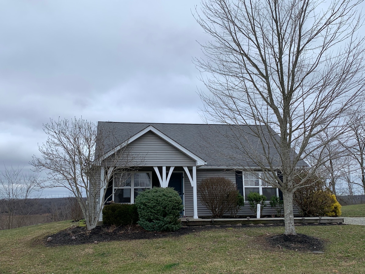 Cottage located in the country. Enjoy amazing views from a covered front porch as you rock in comfortable rocking chairs. Fully furnished and beautifully decorated to make your stay comfortable and delightful. Memory foam mattresses for wonderful sleep and a kitchen for cooking if desired. Pool is behind owners residence and is shared with owners family and possibly 2 additional people June-Sept. We have recently also installed a Tesla High Powered Wall Charger w/60amps. We’d love to have you!