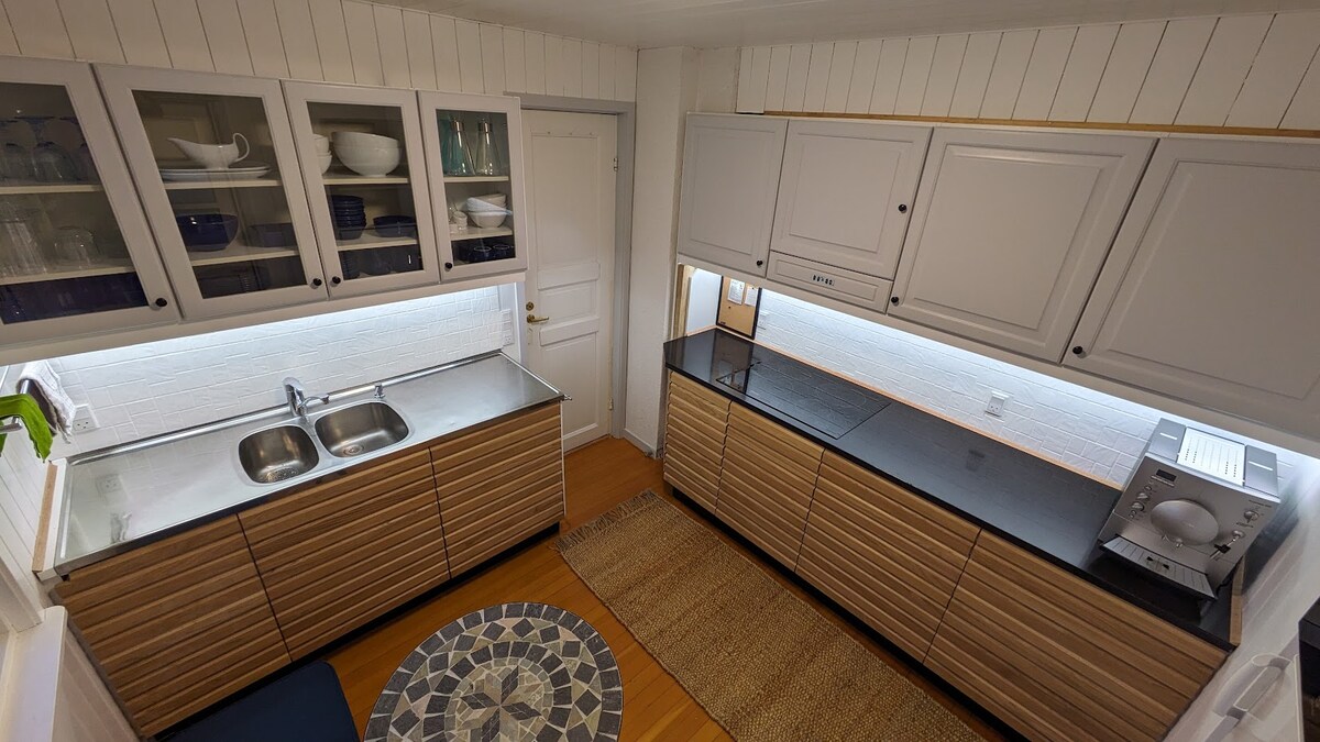 Nedavno renovirana vikend kuća od 131 m2, na malom zatvorenom makadamskom putu u mirnom letnjikovcu. Veliko, skoro potpuno ograđeno, neometano zemljište sa suncem tokom celog dana. Mogućnost igranja lopte, kroket itd. Kuća ima divnu veliku dnevnu sobu sa puno svetlosti i izlazom na dvorište. Dnevna soba je direktno povezana sa trpezarijom i kuhinjom. Ovde ima mesta za sve, bilo da želite da sastavljate slagalicu ili čitate, igrate se ili gledate TV. Dve sobe imaju izlaz u sopstveni hodnik sa kliznim vratima prema dvorištu.